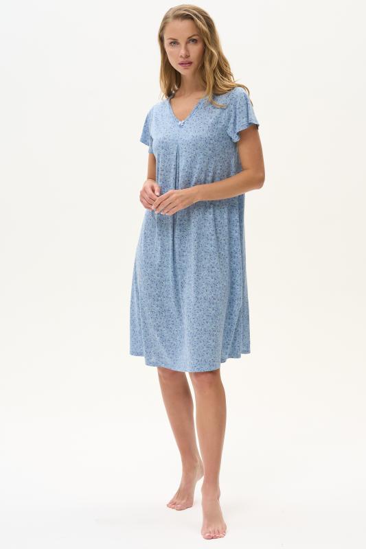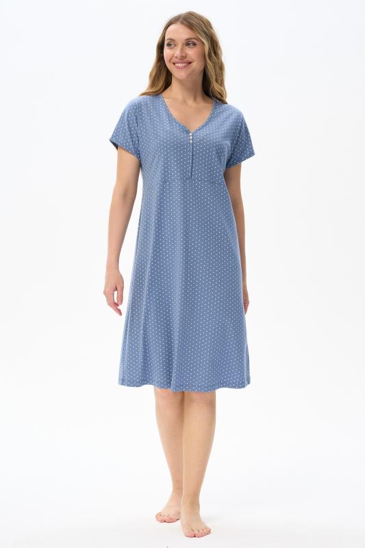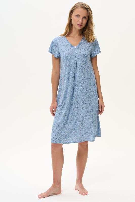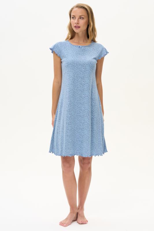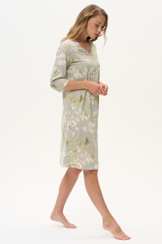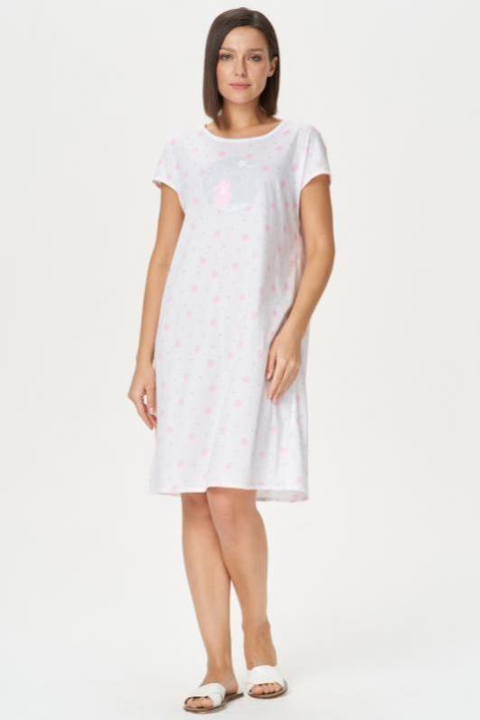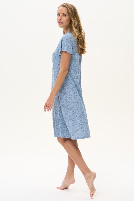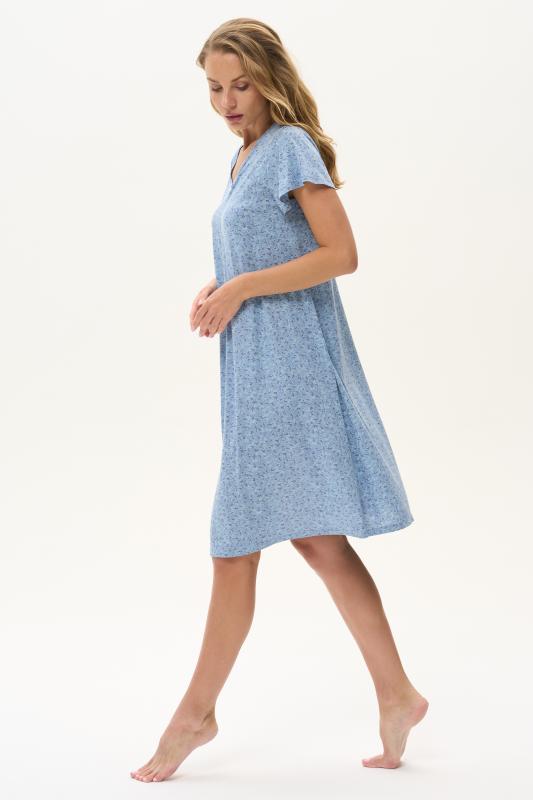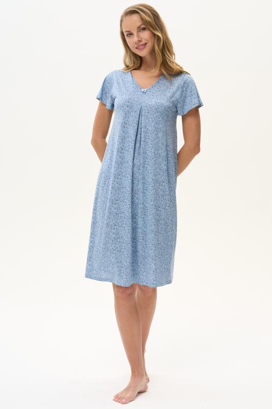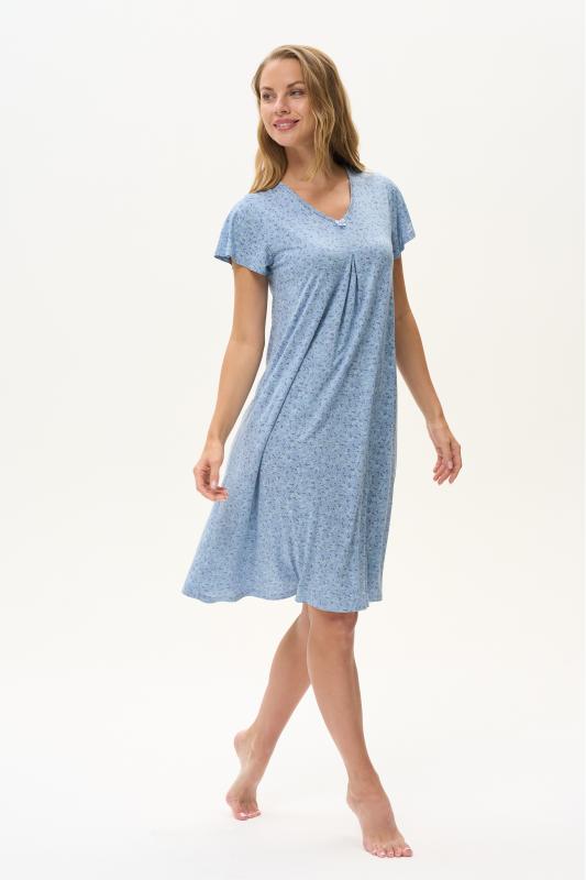 Сорочка А-образного силуэта из хлопкового трикотажного полотна с вискозой. V-вырез горловины, втачные укороченные рукава. Длина изделия ниже колена. Рост модели на фото 178.