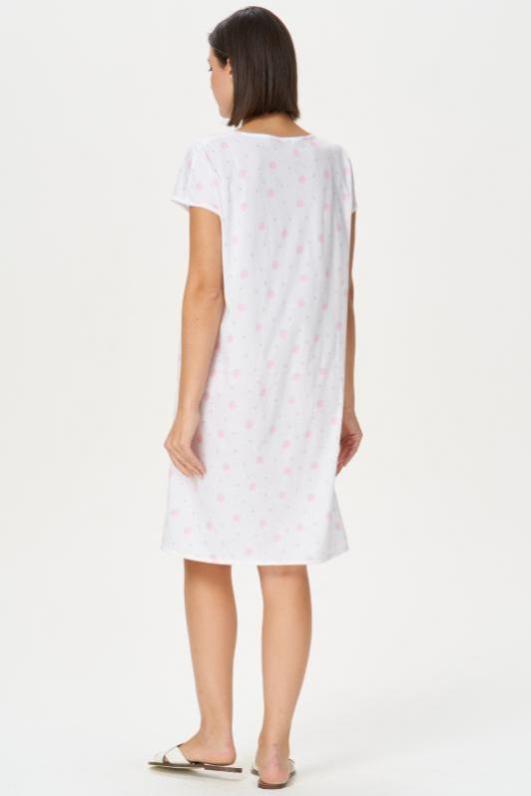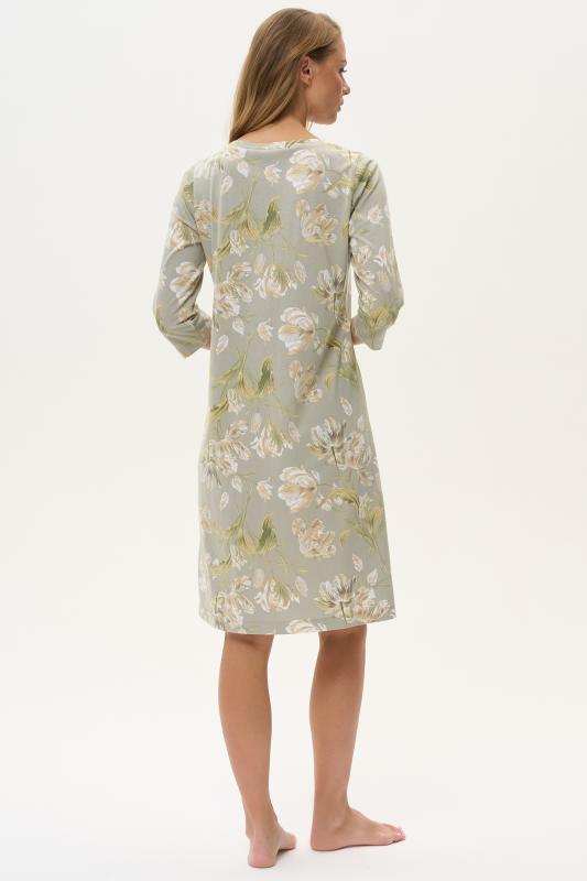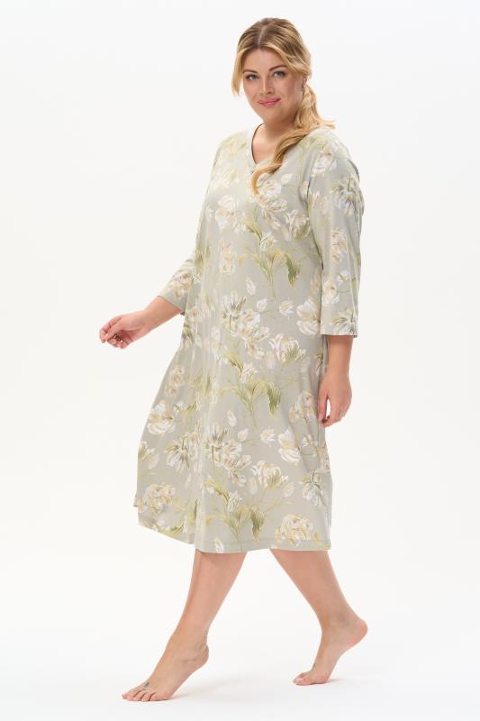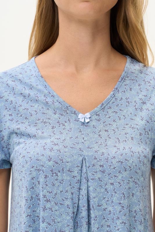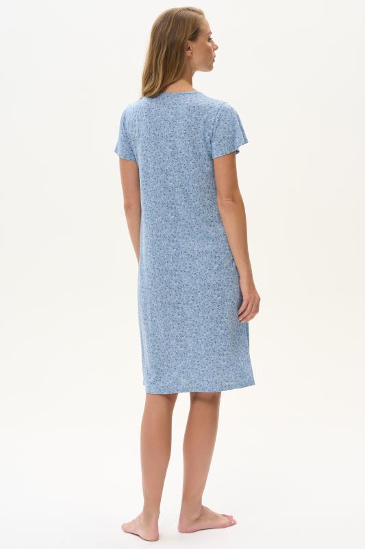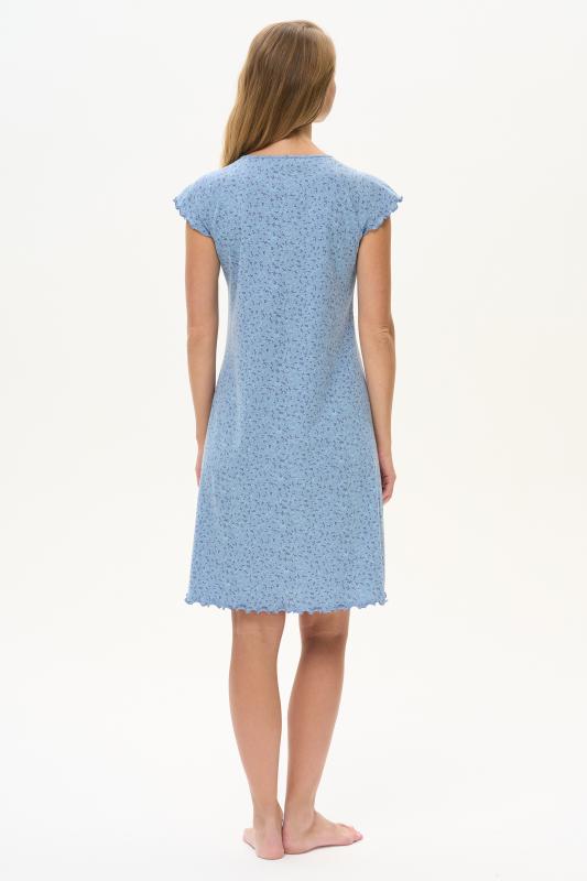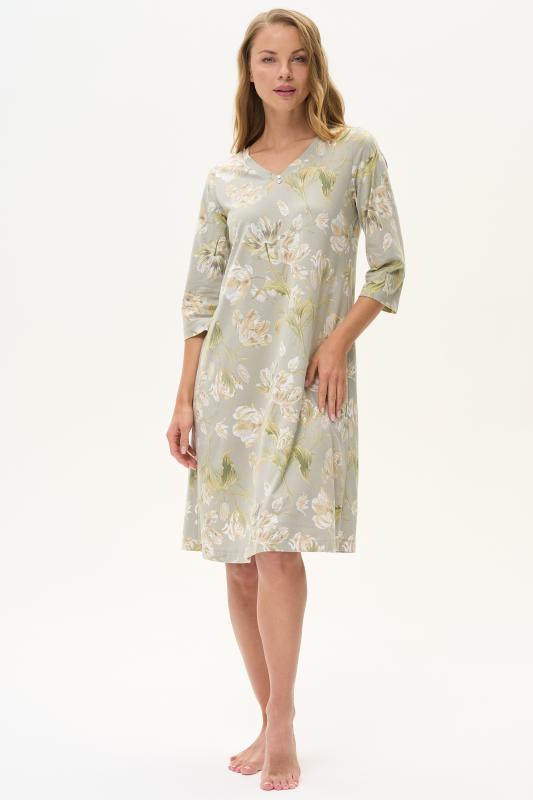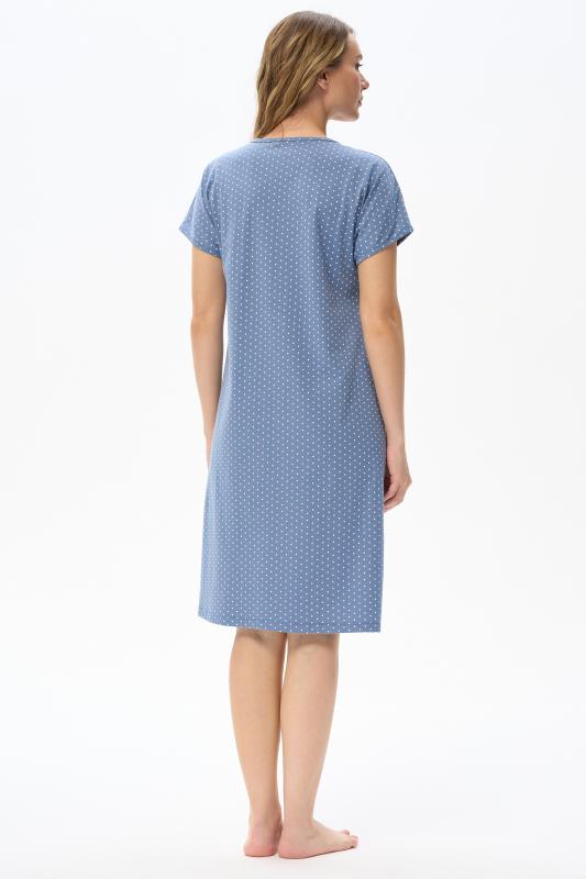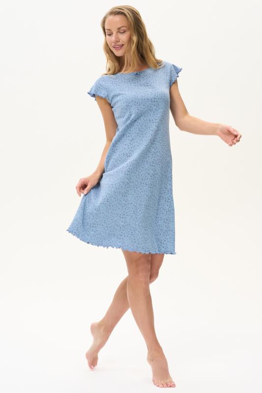 Сорочка А-образного силуэта из хлопкового трикотажного полотна с вискозой. V-вырез горловины, втачные укороченные рукава. Длина изделия ниже колена. Рост модели на фото 178.