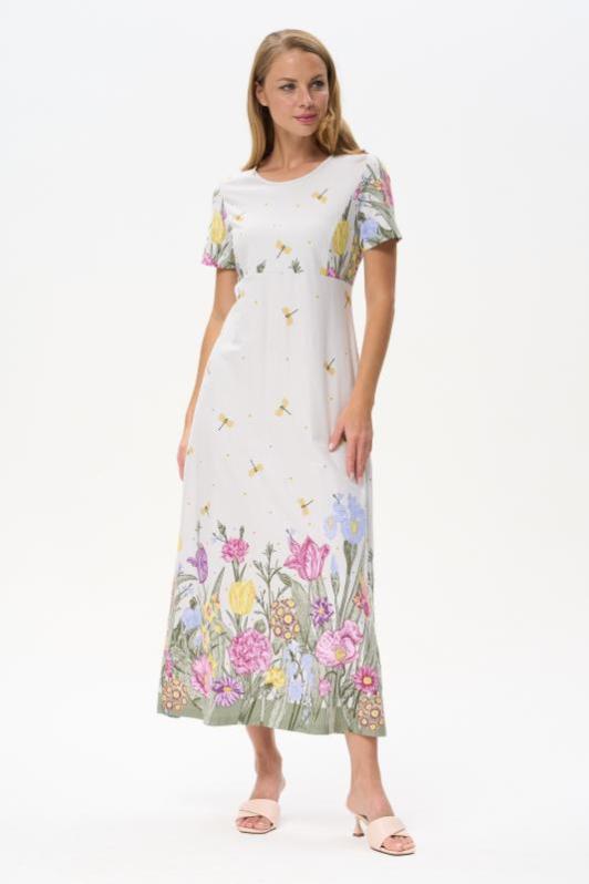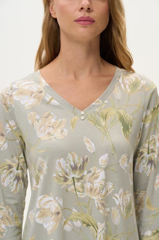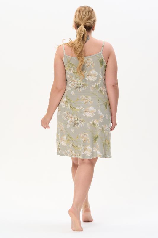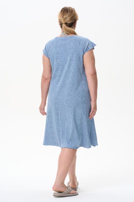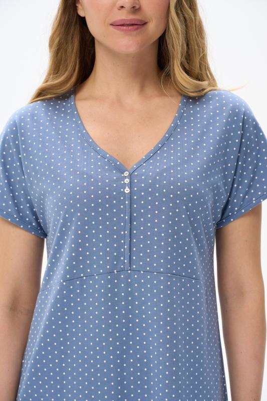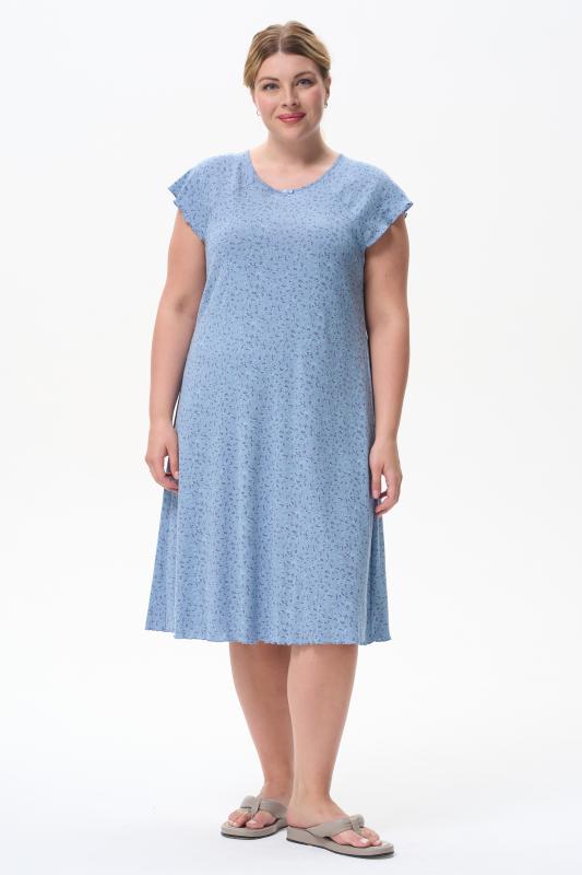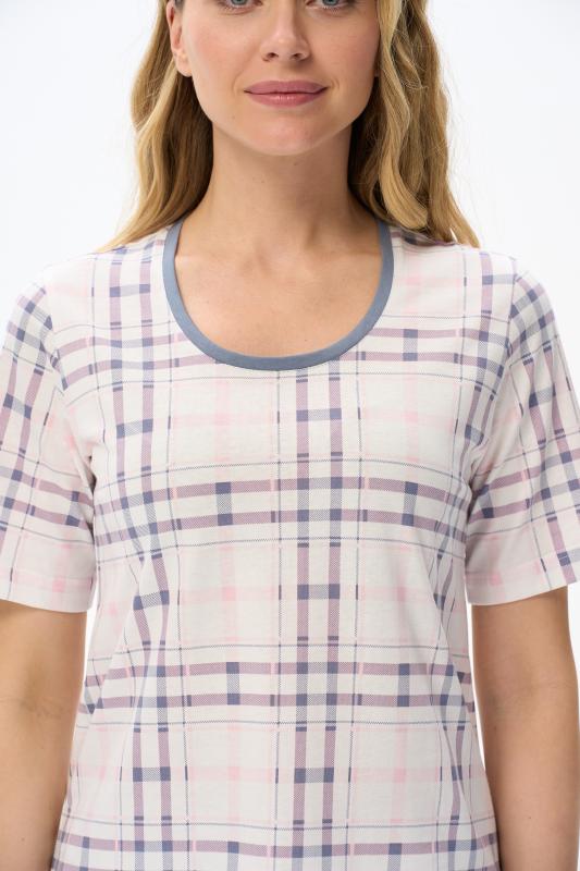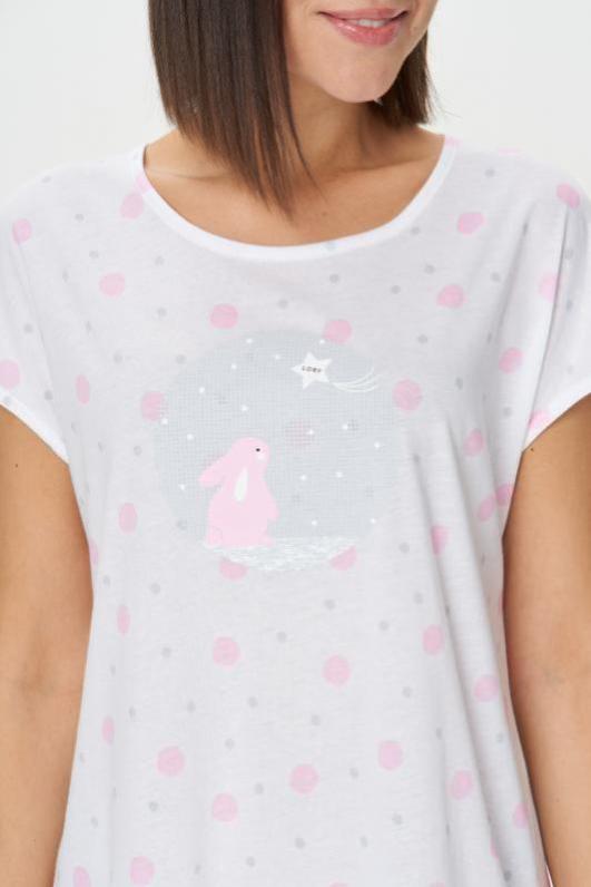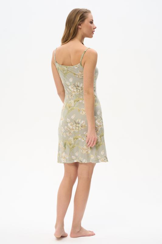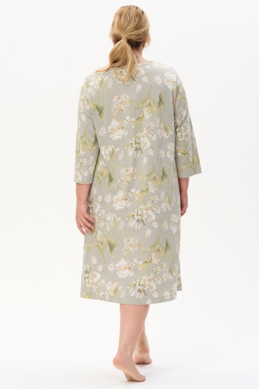 Сорочка А-образного силуэта из хлопкового трикотажного полотна с вискозой. V-вырез горловины, втачные укороченные рукава. Длина изделия ниже колена. Рост модели на фото 178.