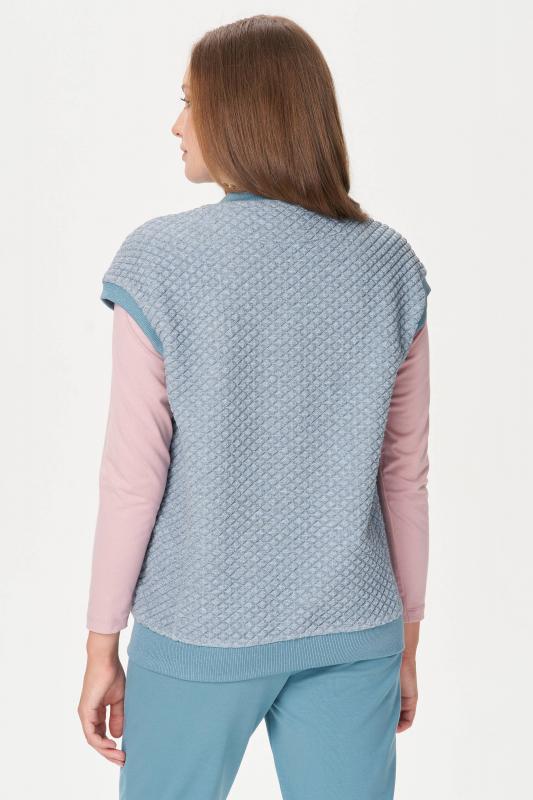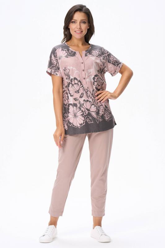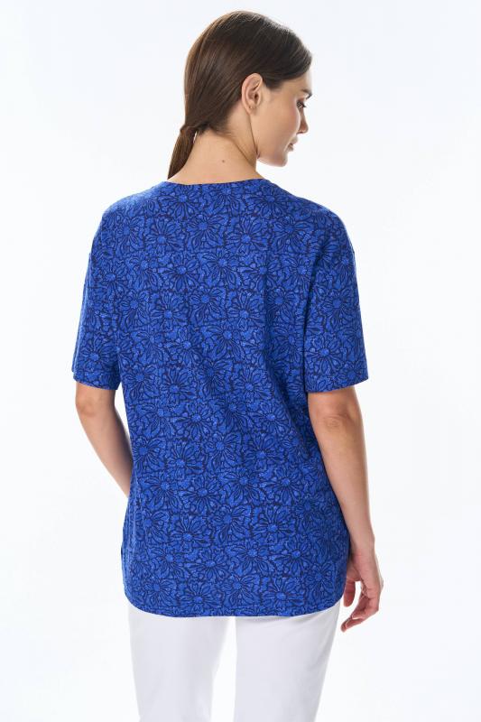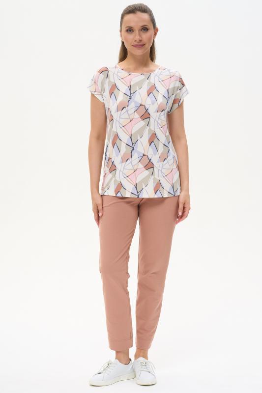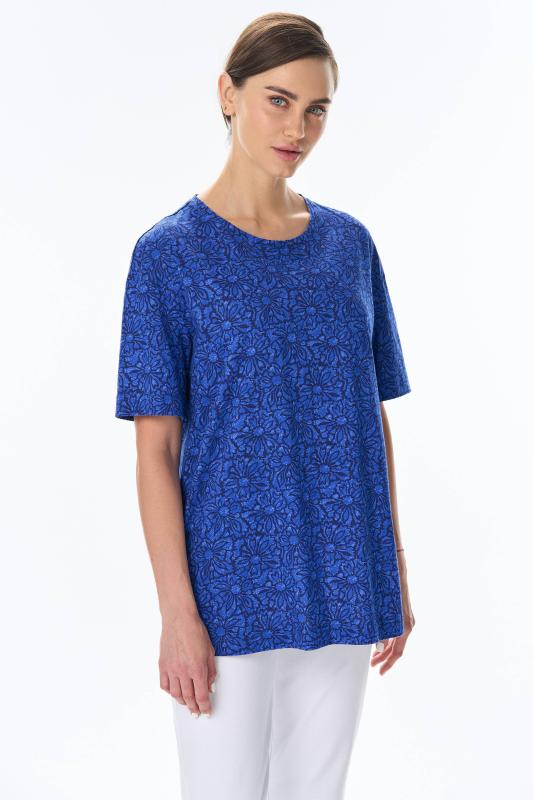 Блузка свободного силуэта из вискозного трикотажного полотна. Круглый вырез горловины, втачные короткие рукава. Рост модели на фото 177см.