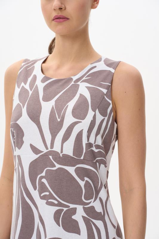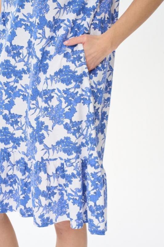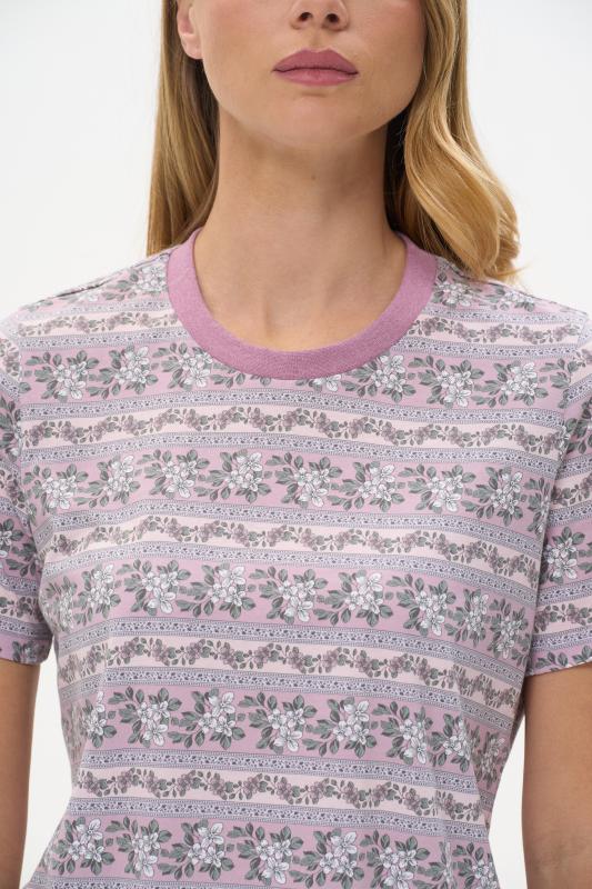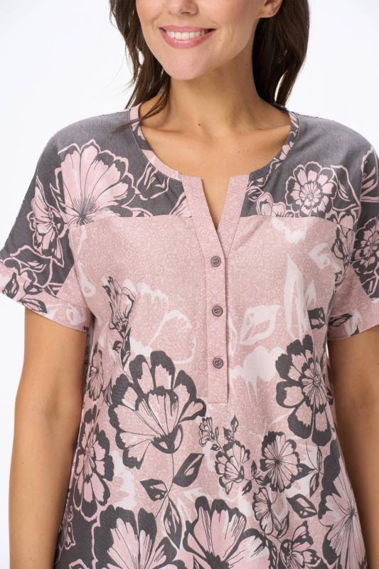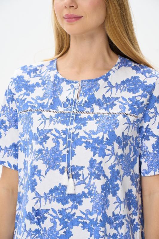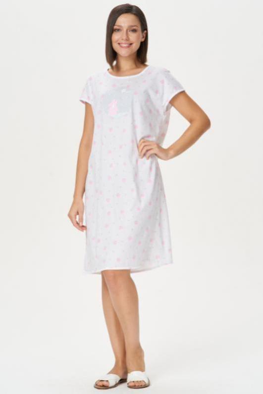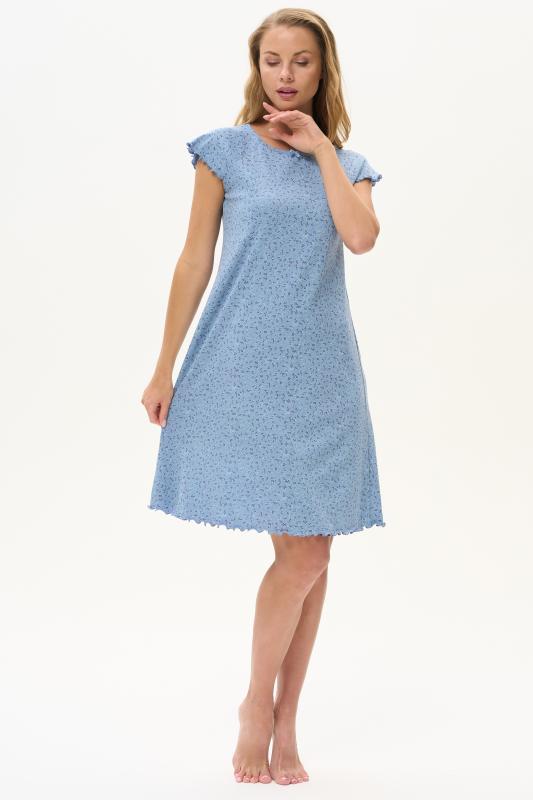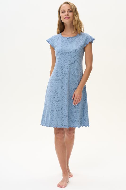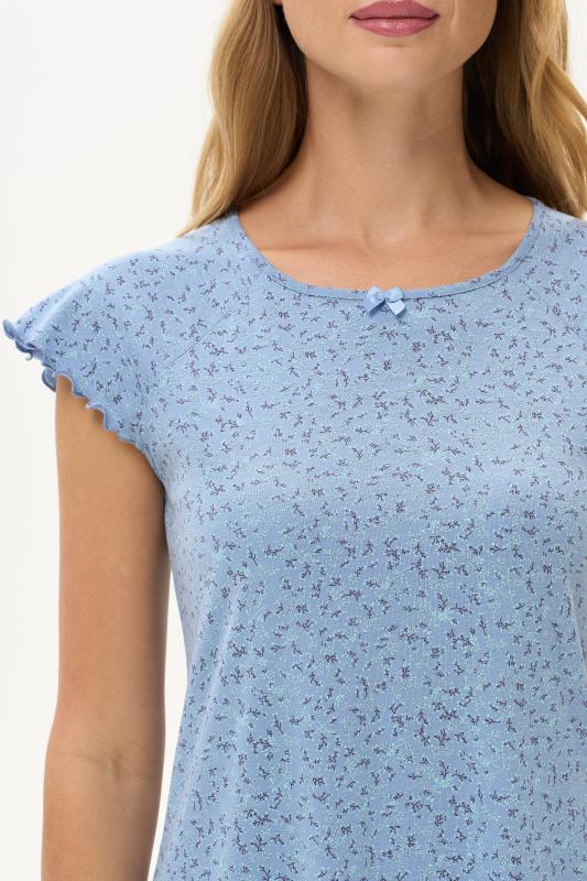 Сорочка с принтом прямого силуэта из хлопкового трикотажного полотна. Округлый вырез горловины, цельнокроеные короткие рукава. Длина изделия ниже колена. Рост модели на фото 170.