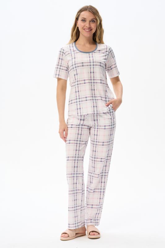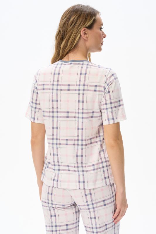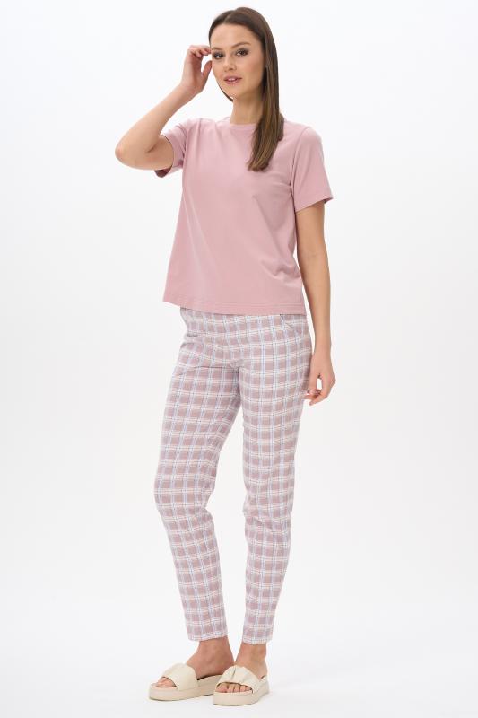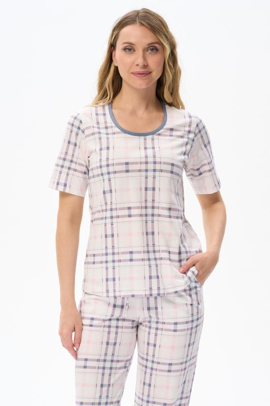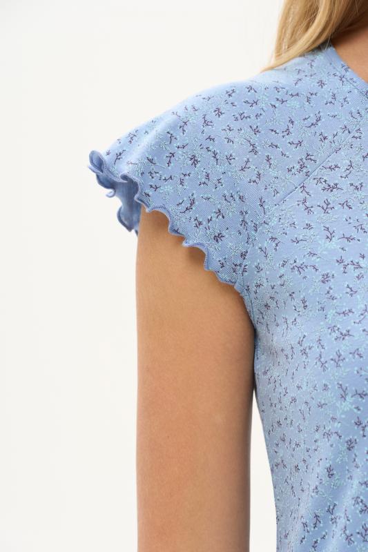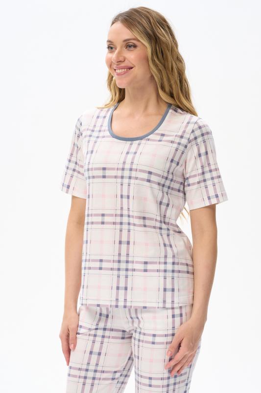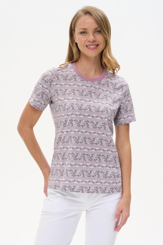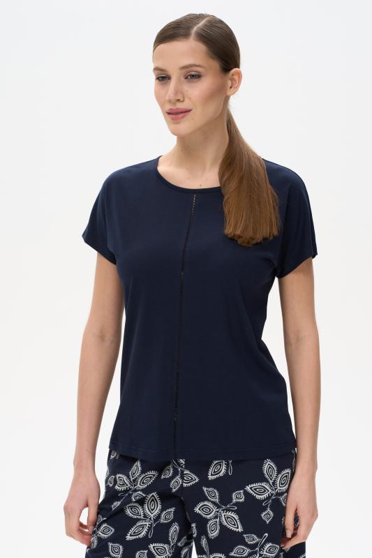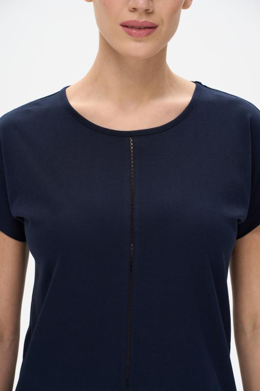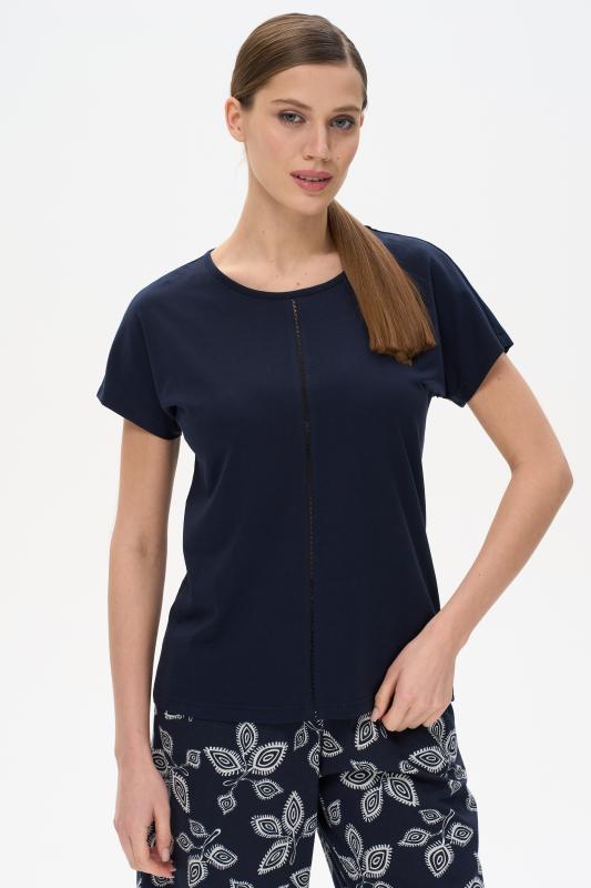 Футболка выполнена из хлопкового трикотажного полотна и декорирована мережкой. Модель с округлой горловиной и цельнокроеным коротким рукавом. Рост модели на фото 177см.
