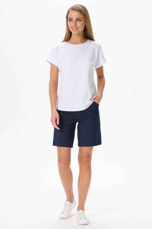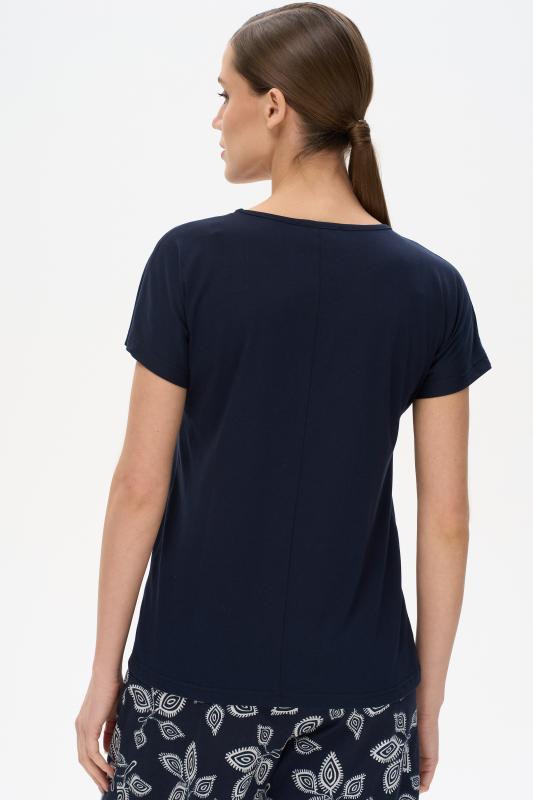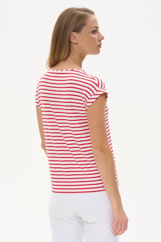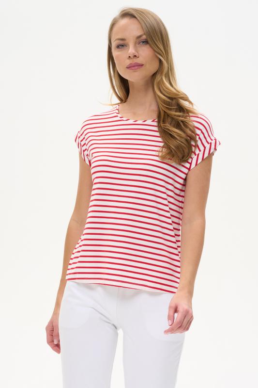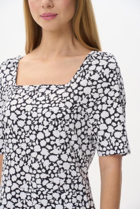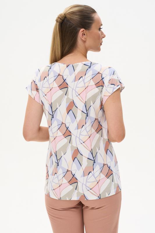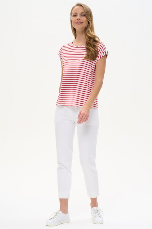 Блузка прямого силуэта из вискозного трикотажного полотна с эластаном. Круглый вырез горловины, цельнокроеные короткие рукава. Рост модели на фото 175 см.