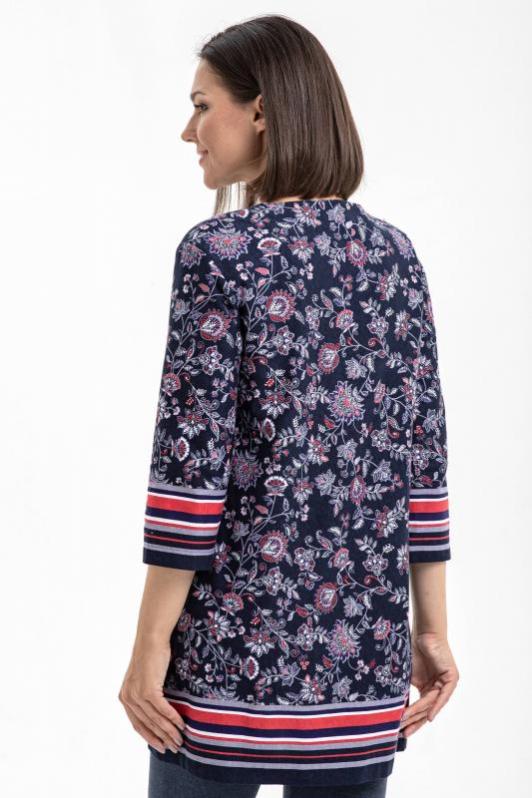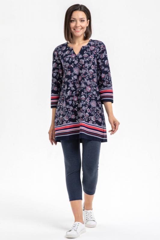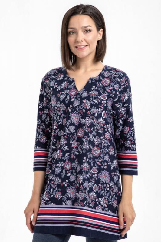 Туника расширенного силуэта из хлопкового трикотажного полотна. Фигурный вырез горловины, втачные рукава длинной чуть ниже логтя. Рост модели на фото 170.