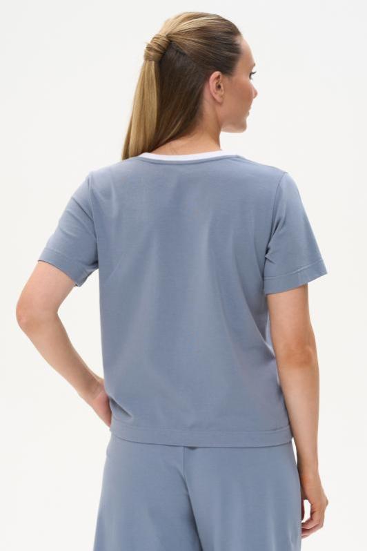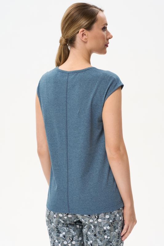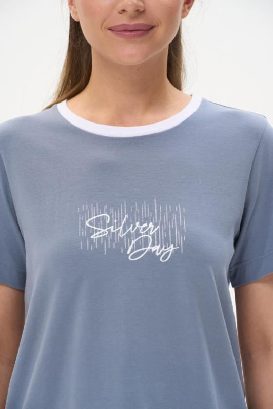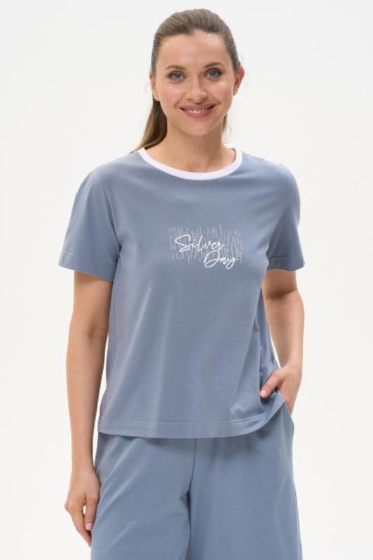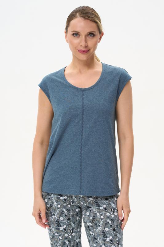 Футболка выполнена из хлопкового меланжевого трикотажного полотна. Средние швы полочки и спинки декорированы мережкой. Модель с круглой горловиной и цельнокроеным коротким рукавом. Рост модели на фото 178см.