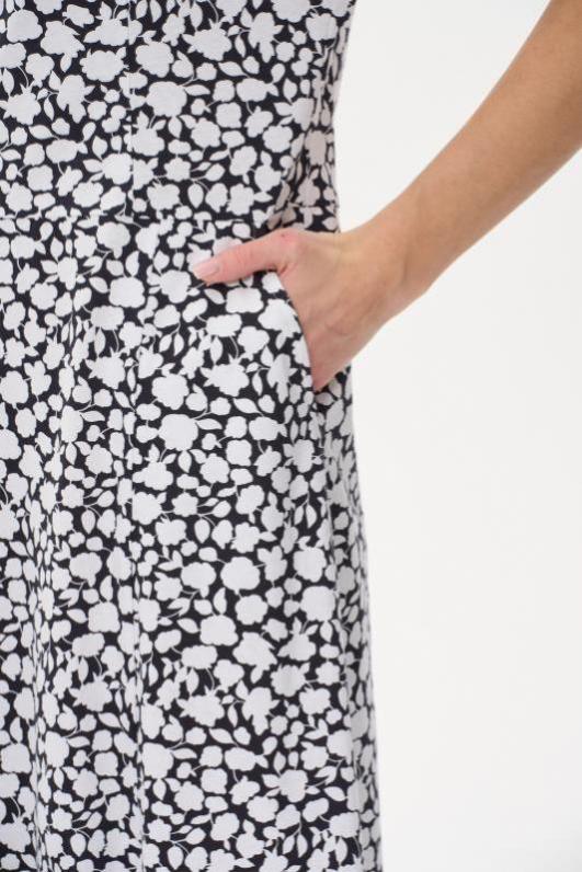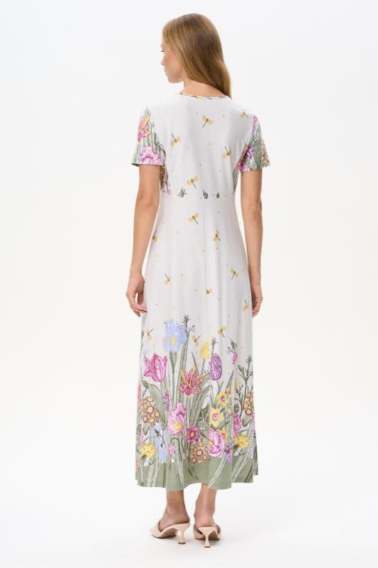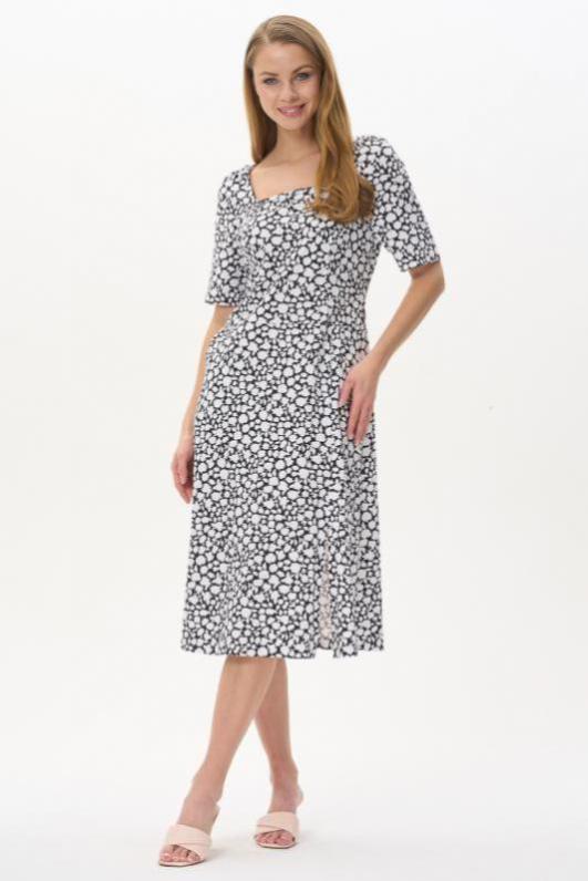 , полочка декорирована мережкой. Втачные рукава длиной до локтя, в боковых швах карманы, фигурная линия низа. Длина изделия ниже колена. Рост