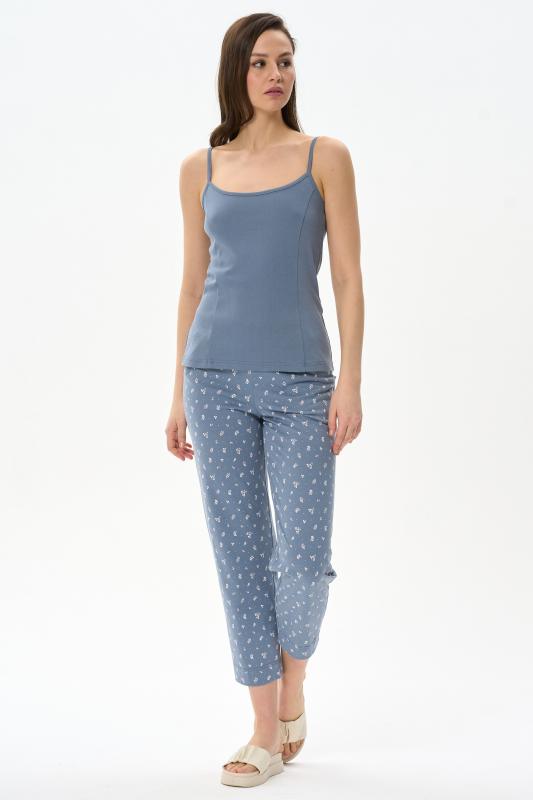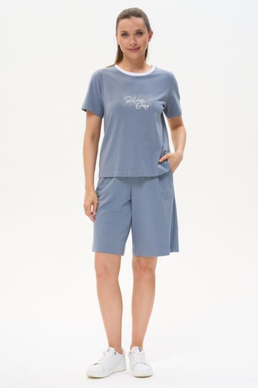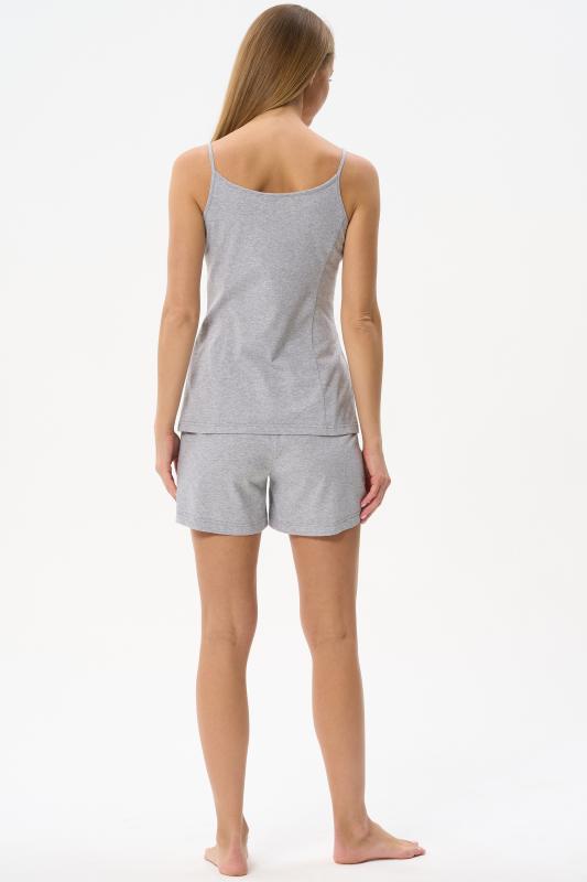 Комплект выполнен из хлопкового меланжевого полотна. Майка с круглым вырезом горловины. Спереди подрез и средний шов декорирован мережкой. Шорты без карманов, пояс с эластичной лентой внутри. Боковые швы шорт декорированы мережкой. Рост модели на фото 178см.