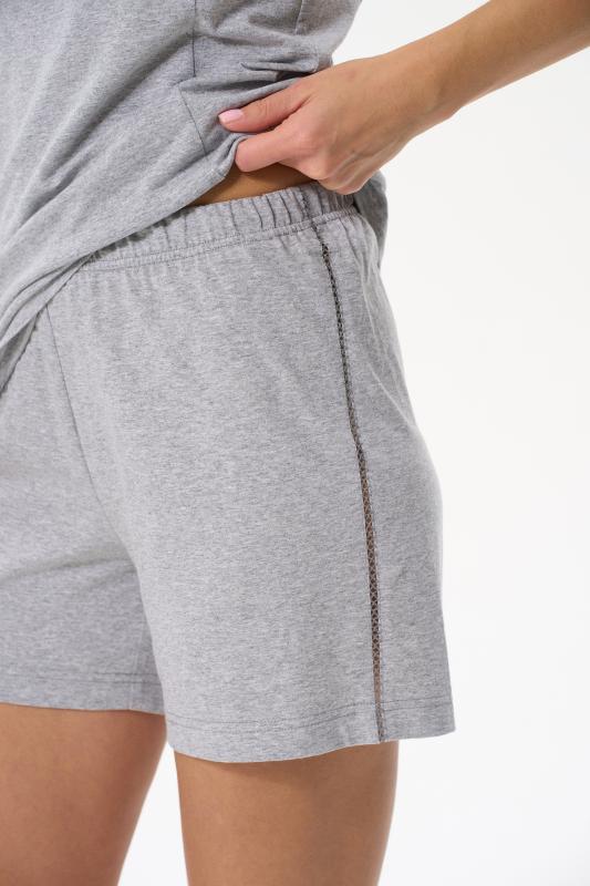 Шорты с карманами из хлопкового меланжевого трикотажного полотна. По рельефам передних половинок отделочная строчка. Цельнокроенный пояс с эластичной лентой внутри. Рост модели на фото 170