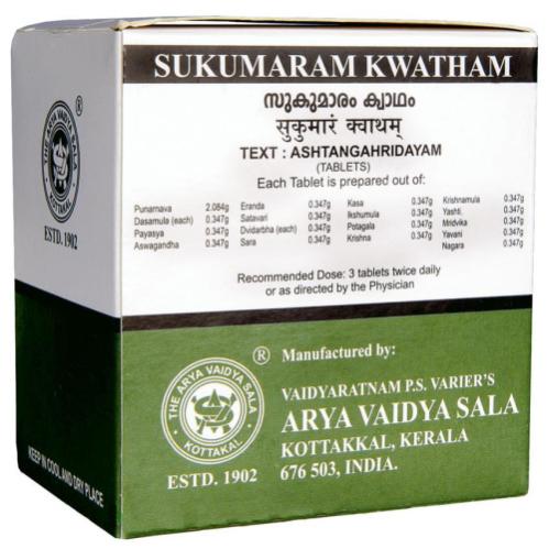 «Сукумарам Кватхам» (Sukumaram Kwatham) — аюрведический препарат, который, согласно оригинальным текстам Аюрведы, обладает лечебным действием на женскую репродуктивную систему и устраняет ряд проблем, связанных с пищеварением. Этот препарат благодаря своим качествам способен сопровождать женщину в любой период жизни. Он нормализует менструальный цикл, оказывая помощь при нерегулярных (олигоменорея), болезненных и чрезмерно обильных месячных, аменорее, снимает боли, спазмы, улучшает кровоснабжение репродуктивных органов.