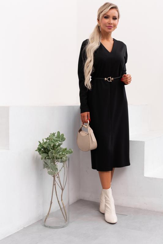 Универсальное платье прямого силуэта из трикотажного полотна. Округлая горловина на внутренней обтачке. Короткий втачной рукав со спущенным плечом оканчивается притачной манжетой. Низ ровный, без разрезов. Пояс из основного материала в комплекте.