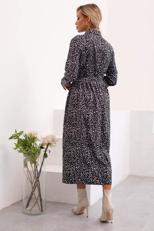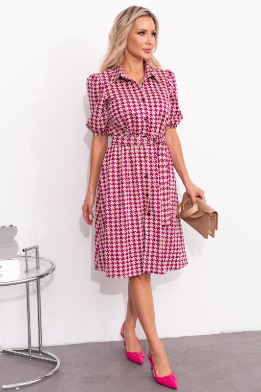 Платье приталенного силуэта. Горловина оформлена отложным воротником на стойке, переходящей в планку с застежкой на петли и пуговицы. Короткий втачной рукав, по окату заложена сборка, низ на резинке. Платье отрезное по линии талии, присборено на эластичную резинку. Низ ровный, без разрезов. Пояс из основного материала в комплекте.