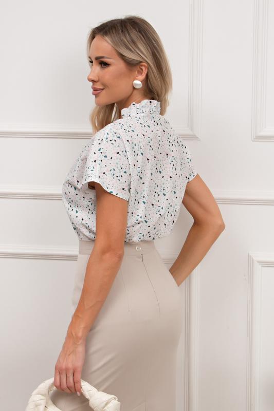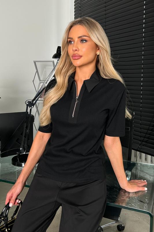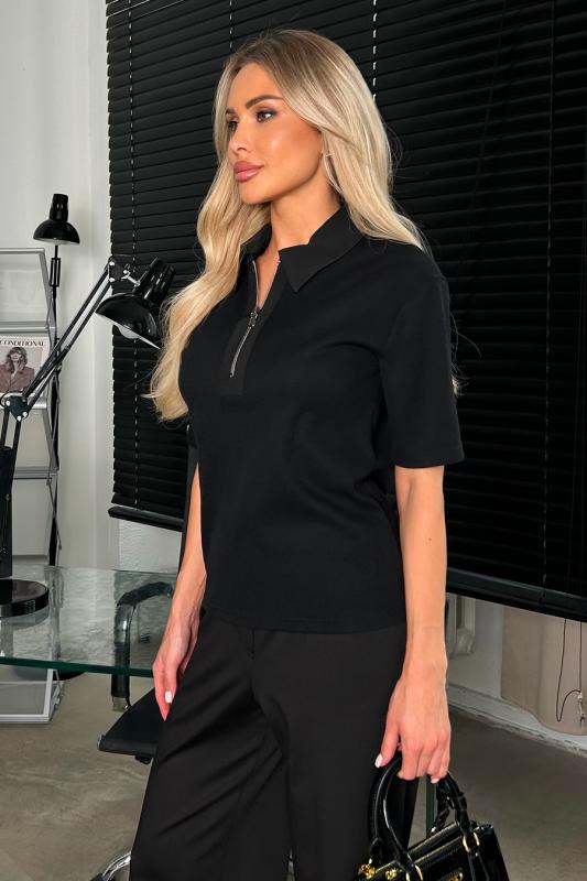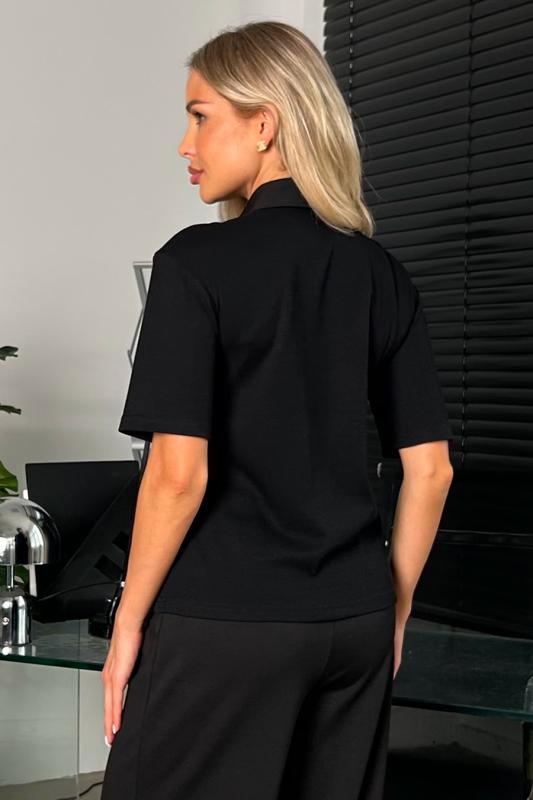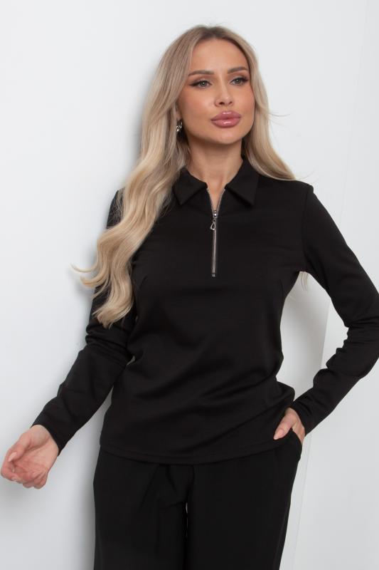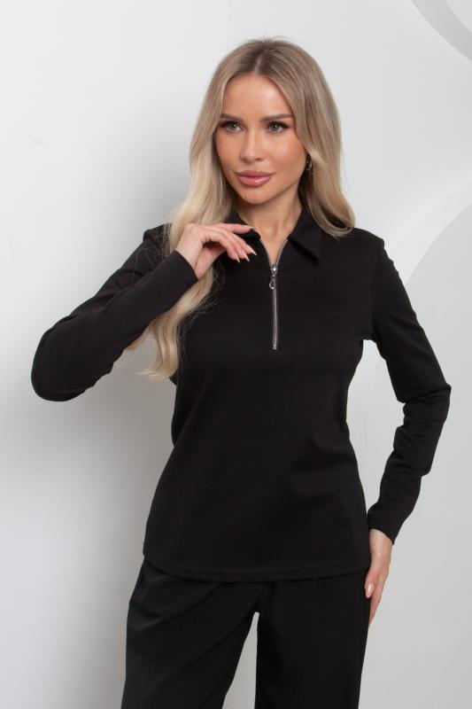 Стильный джемпер из трикотажного полотна в рубчик. Короткий втачной рукав. Отложной воротник и планка выполнены из отделочной ткани Ниагара. По планке застежка-молния. Низ ровный без разрезов.