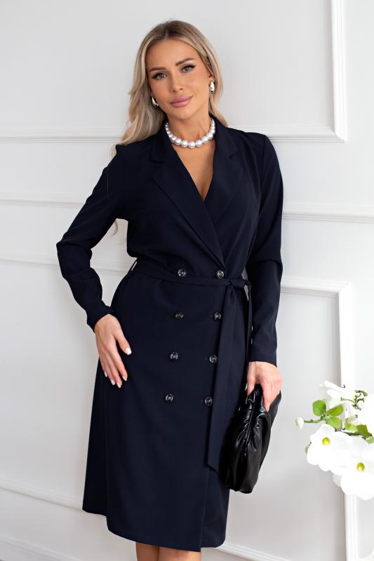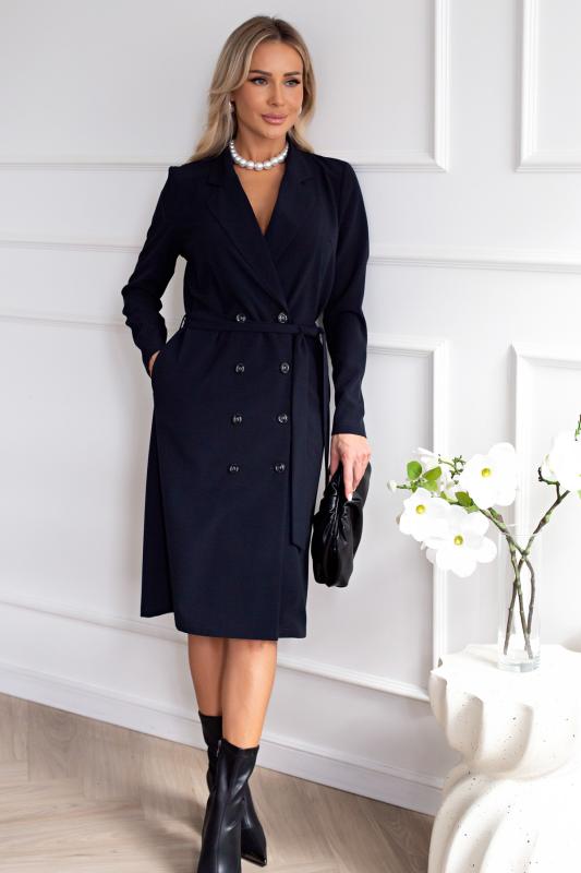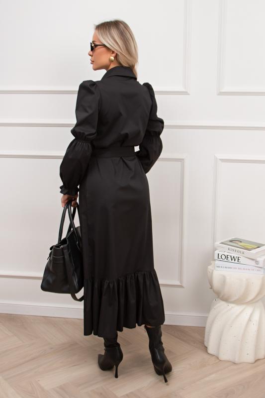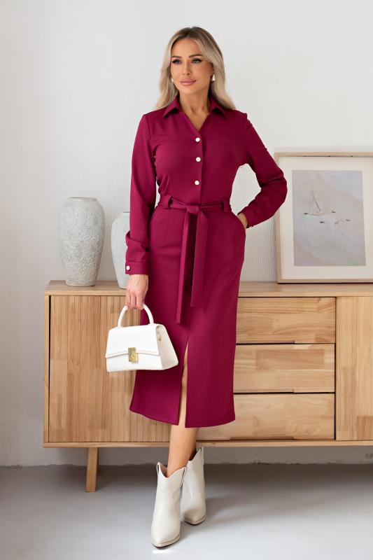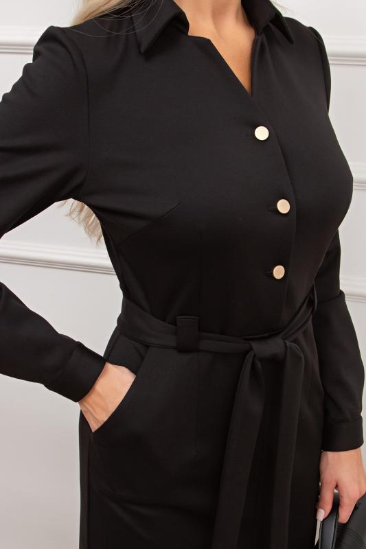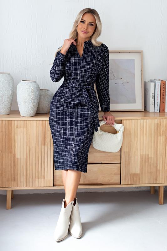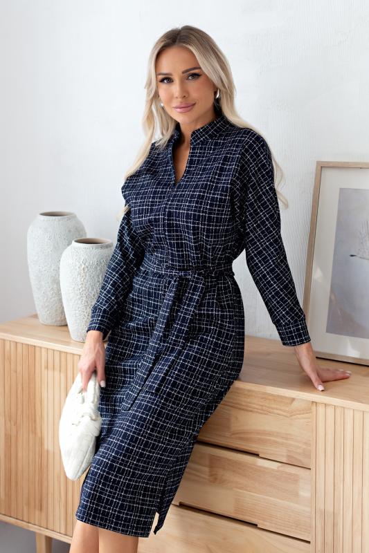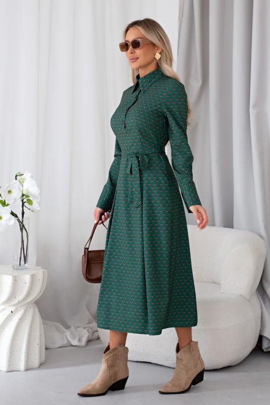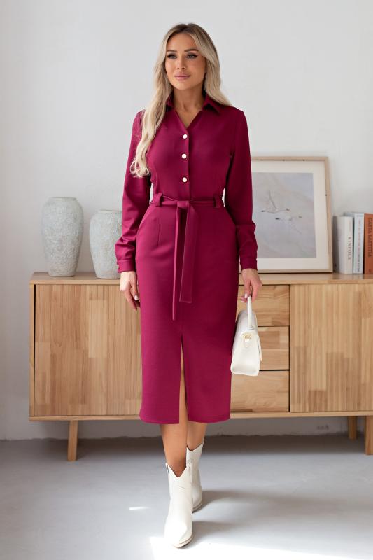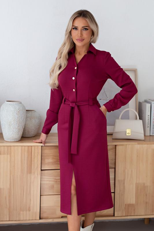 Стильное платье полуприлегающего силуэта. V-образная горловина оформлена отложным воротником на стойке. По переду застежка на петли и пуговицы. Длинный втачной рукав оканчивается притачной манжетой. Модель отрезная по линии талии дополнена шлёвками под пояс. В боковых швах функциональные карманы. Низ ровный, по переду разрез. Пояс из основной ткани в комплекте.