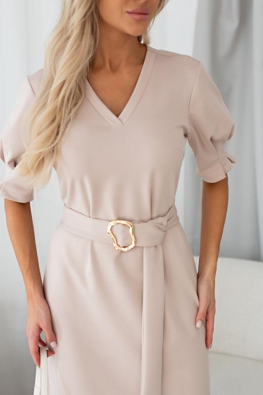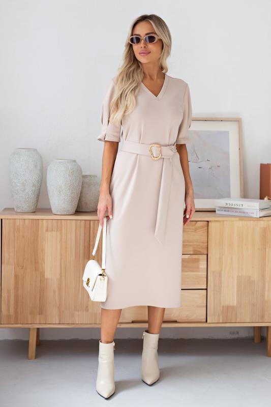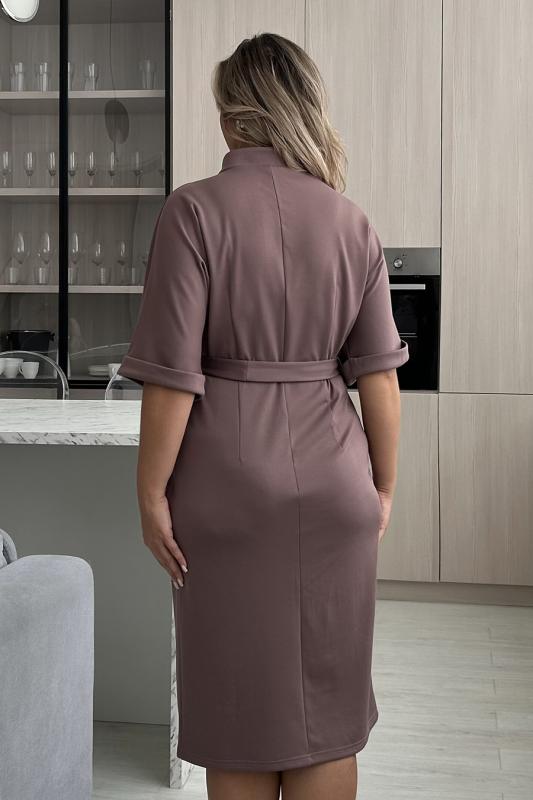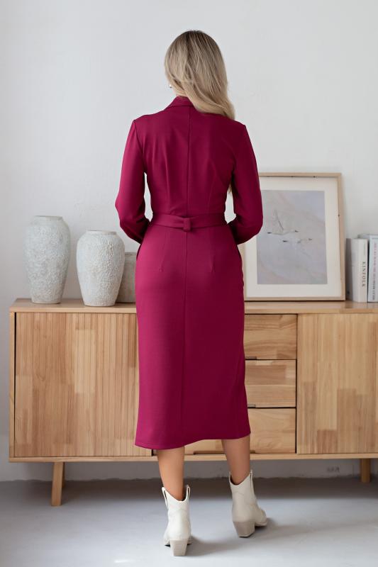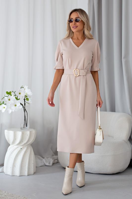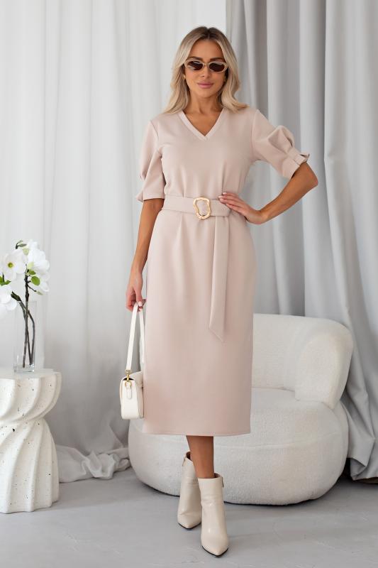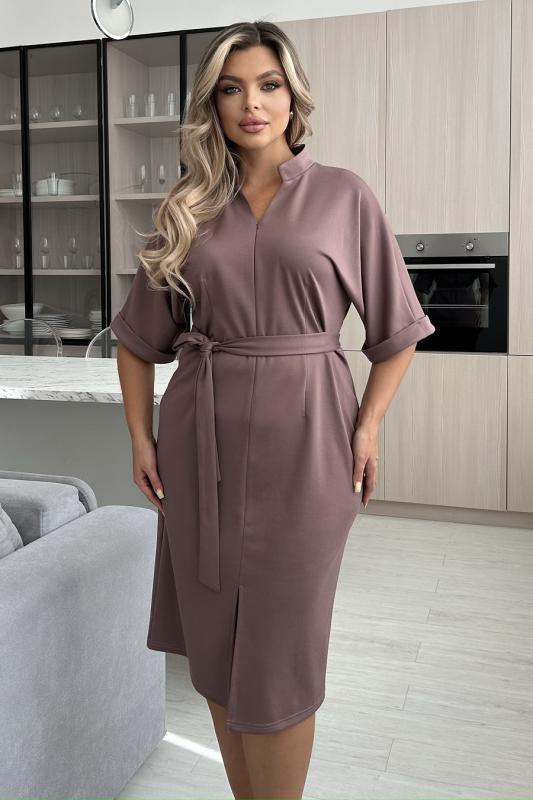 Платье приталенного силуэта из однотонного трикотажа. Круглый вырез горловины обработан внутренней обтачкой. Втачные рукава длинной 3-4. Отрезная линия талии. По спинке потайная застежка на молнию. Пояс из основного материала входит в комплект.