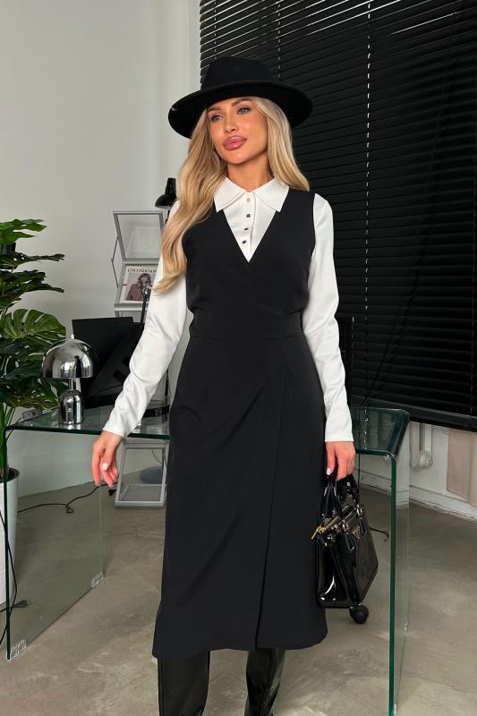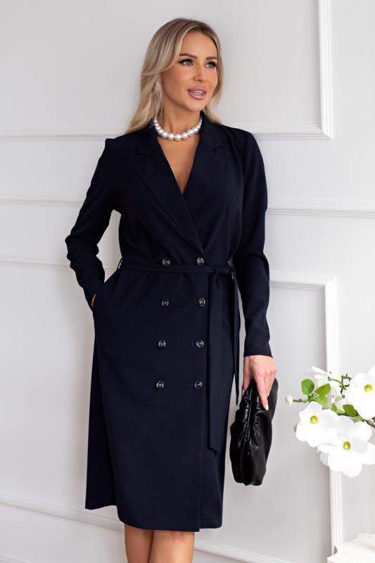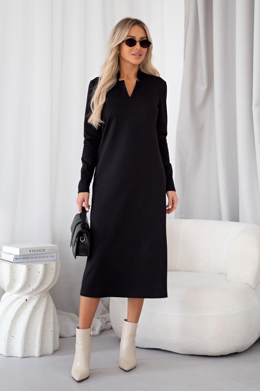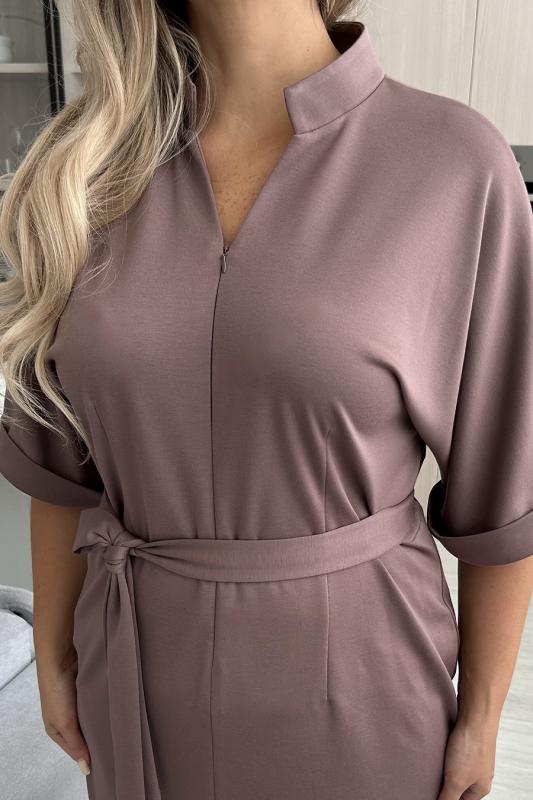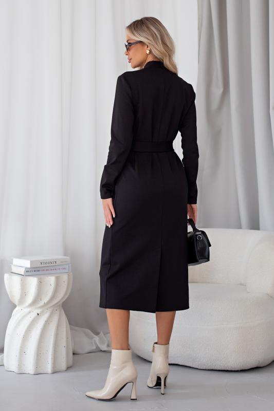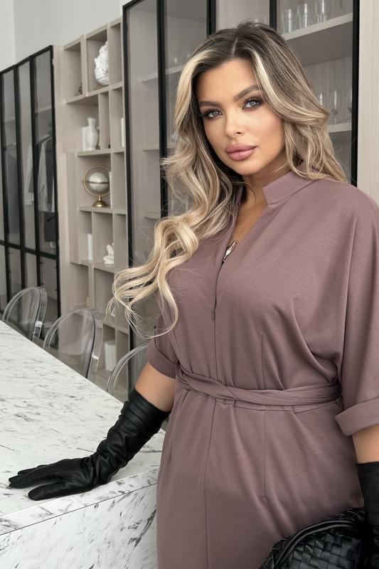 Лаконичное платье прямого силуэта выполнено из трикотажного полотна. Длинный цельнокроеный рукав летучая мышь, оканчивается притачной манжетой. Горловина оформлена воротником - стойка. По переду застежка на потайную молнию. По боковым швам расположены функциональные карманы. Низ ровный, по бокам разрезы. Пояс из основного материала в комплекте.