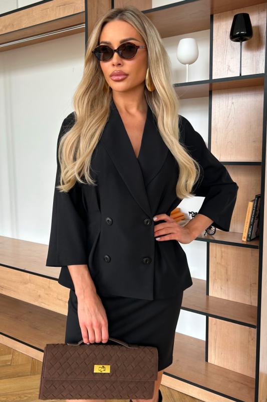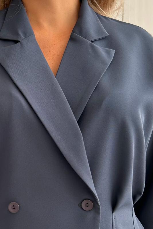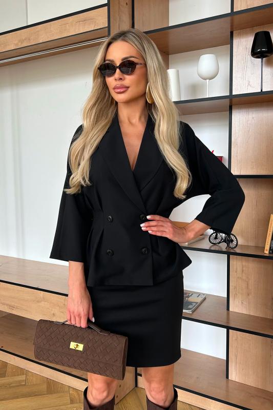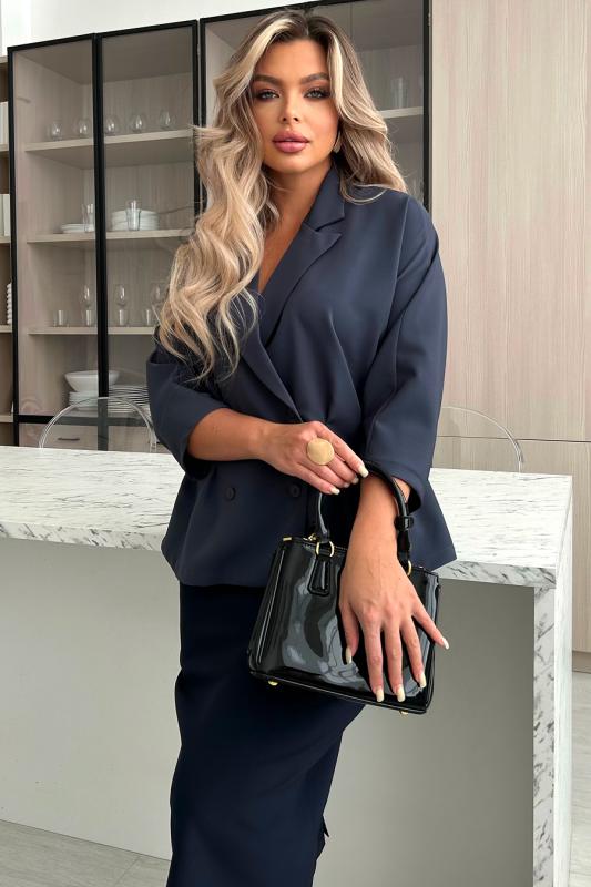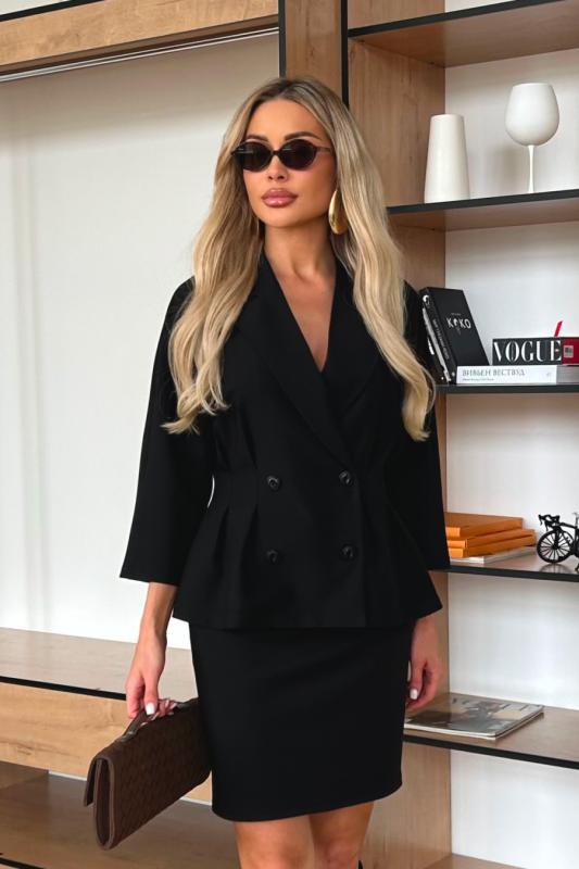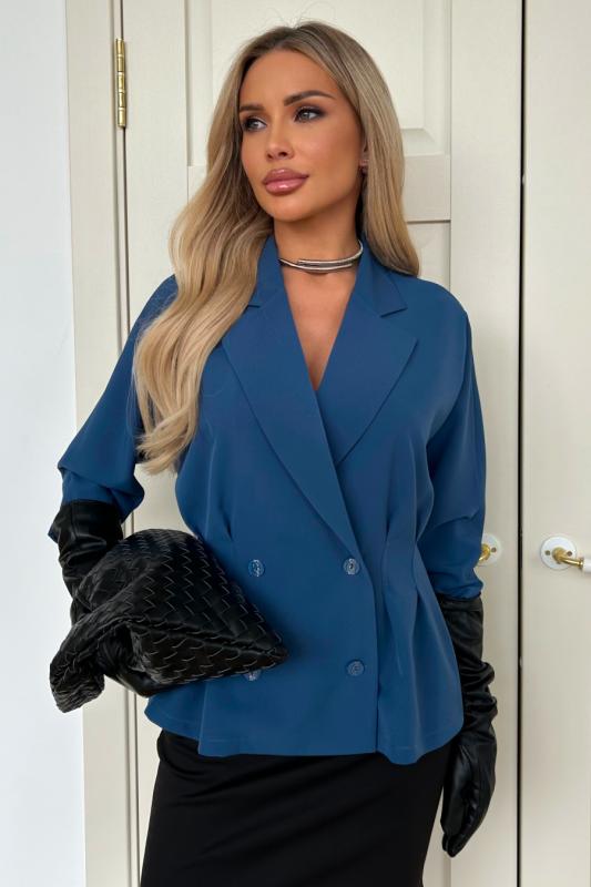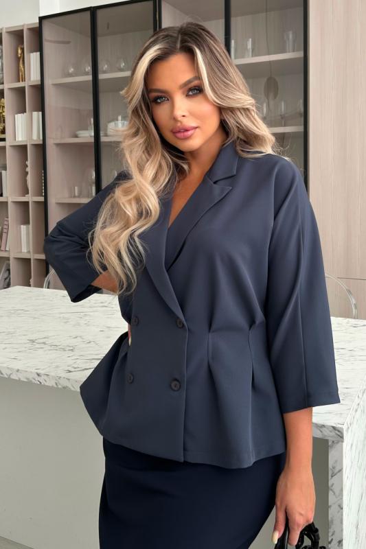 Комфортный жакет приталенного силуэта выполнен из легкой костюмной ткани. Цельнокроенный рукав длиной 7-8. Английский отложной воротник. Двубортная застежка на петли и пуговицы. По линии талии застрочены складки. Низ ровный, без разрезов.