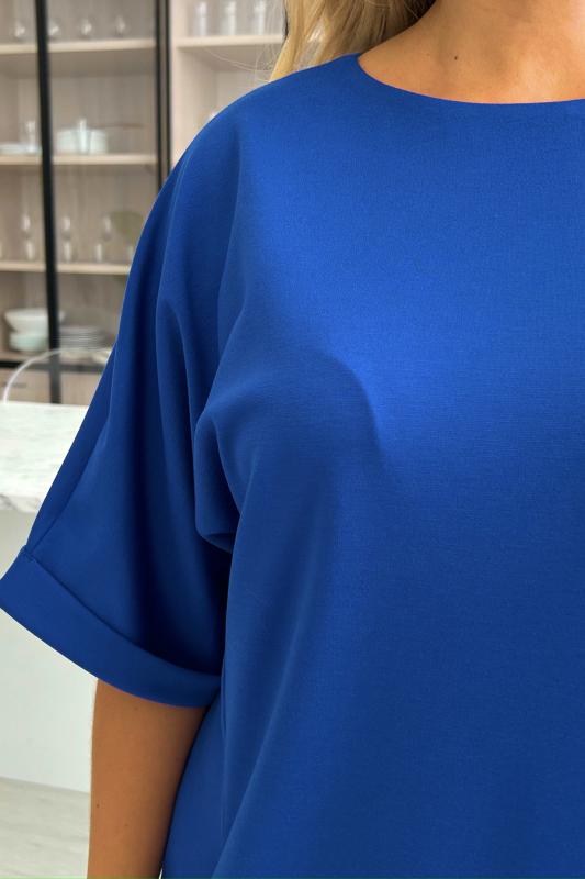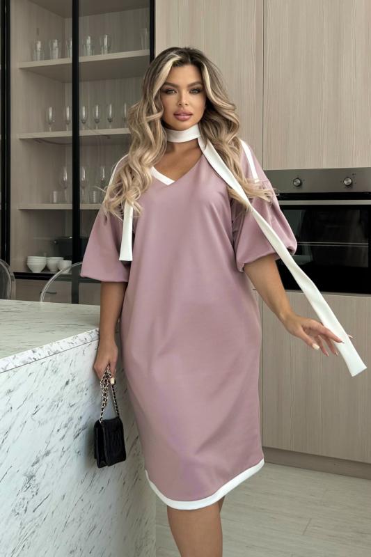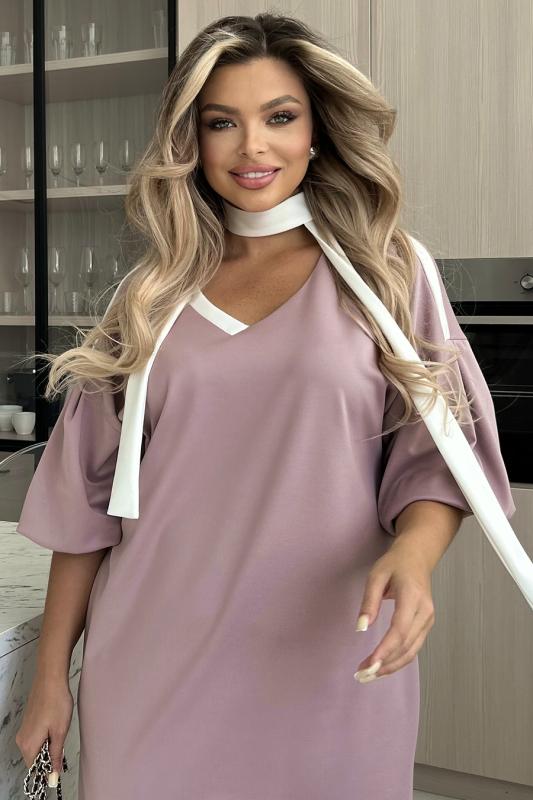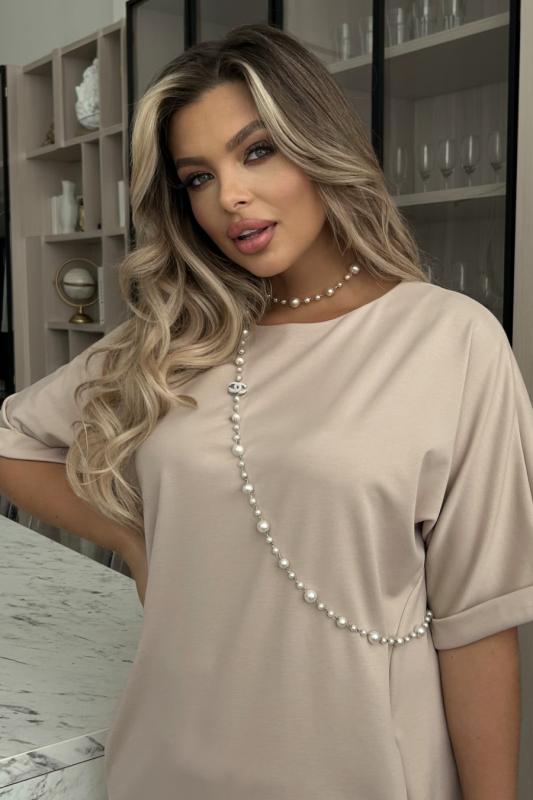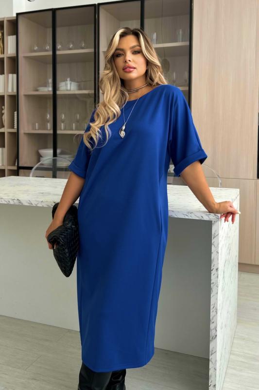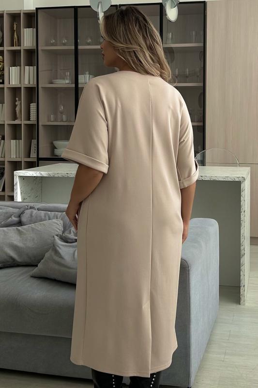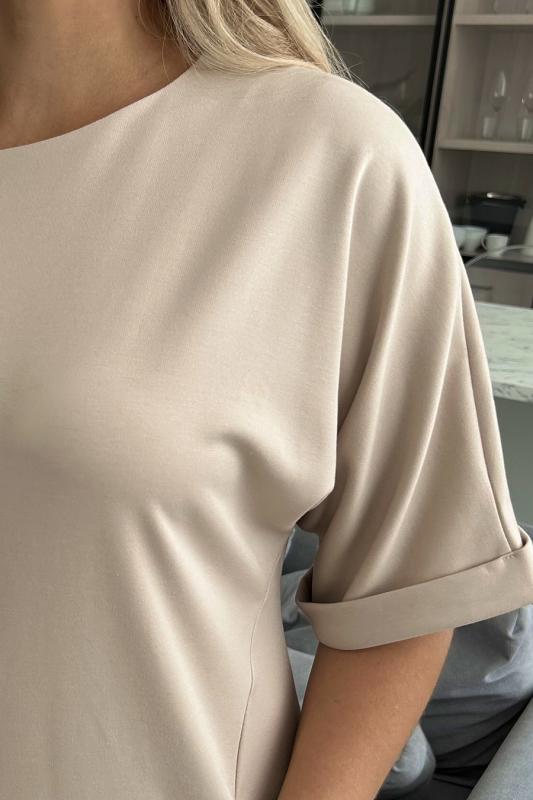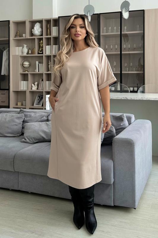 Стильное платье прямого силуэта выполнено из трикотажного полотна Футер 2х нитка. Короткий втачной рукав по низу оформлен двойным отворотом. Округлая горловина с необработанным срезом. Низ ровный, по бокам разрезы.