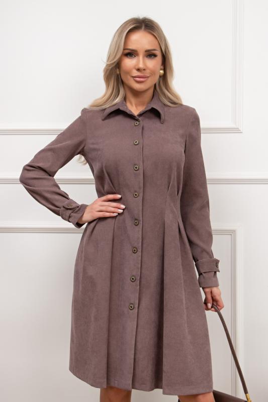 Платье-рубашка приталенного силуэта изготовлено из ткани «вельвет». Горловина оформлена отложным воротником на стойке. По переду выполнена планка с застежкой на петли и пуговицы. Длинный втачной рукав по запястью оформлен патой. По линии талии застрочены складки. Низ ровный, без разрезов.