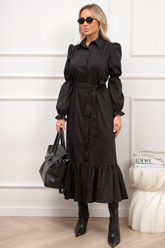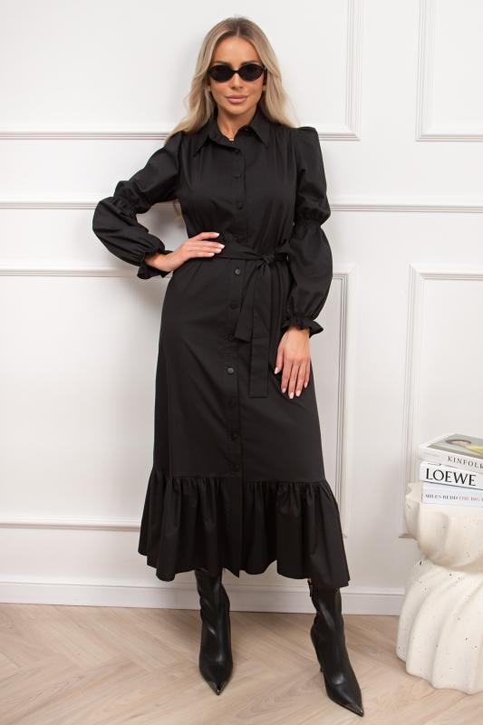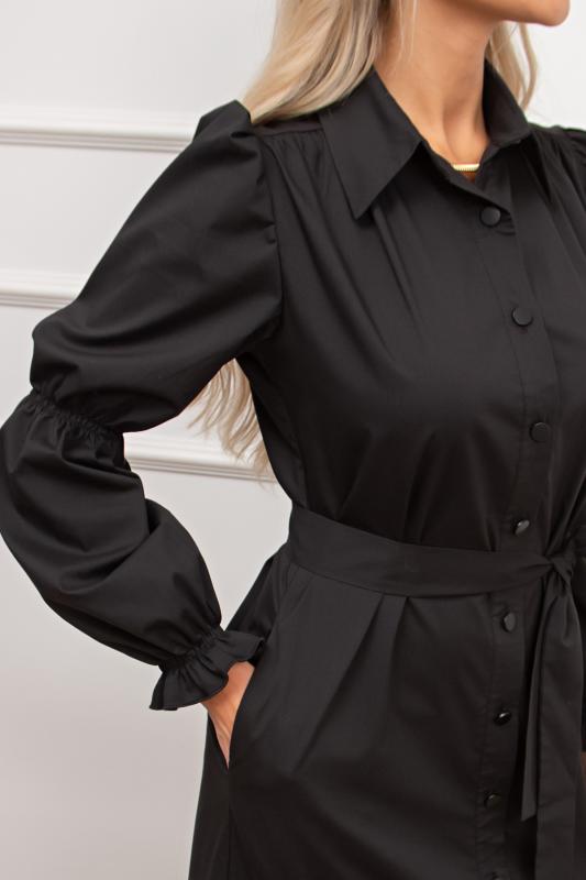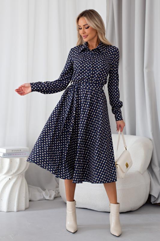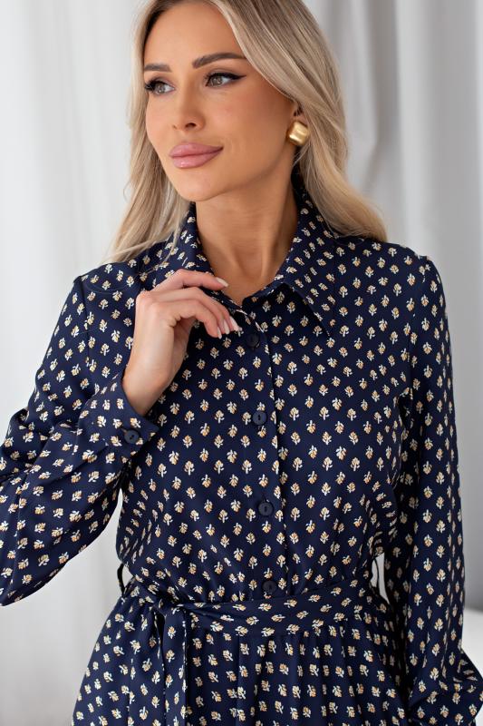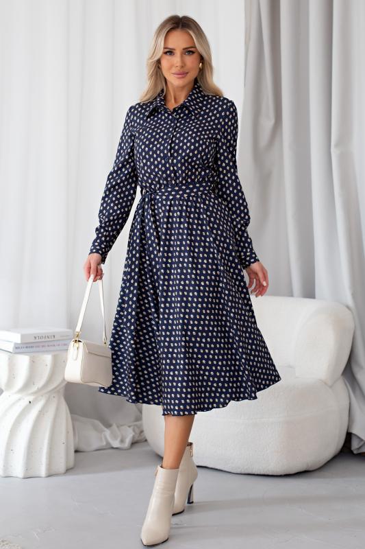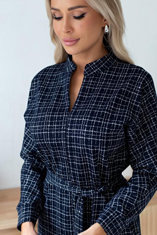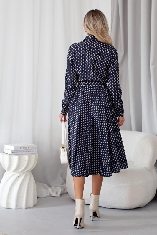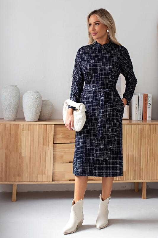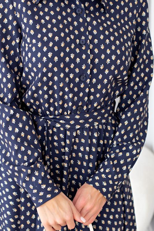 Красивое платье приталенного силуэта из легкой ткани - ниагара. Горловина оформлена отложным воротником на стойке. По переду выполнена планка с застежкой на петли и пуговицы. Длинный втачной рукав, оканчивается притачной манжетой. В боковых швах функциональные карманы. Модель отрезная по линии талии, присобрана на эластичную резинку. Тканевый пояс дополнительно акцентирует талию. Модель прекрасно дополнит ваш гардероб.