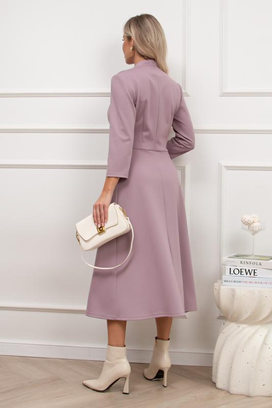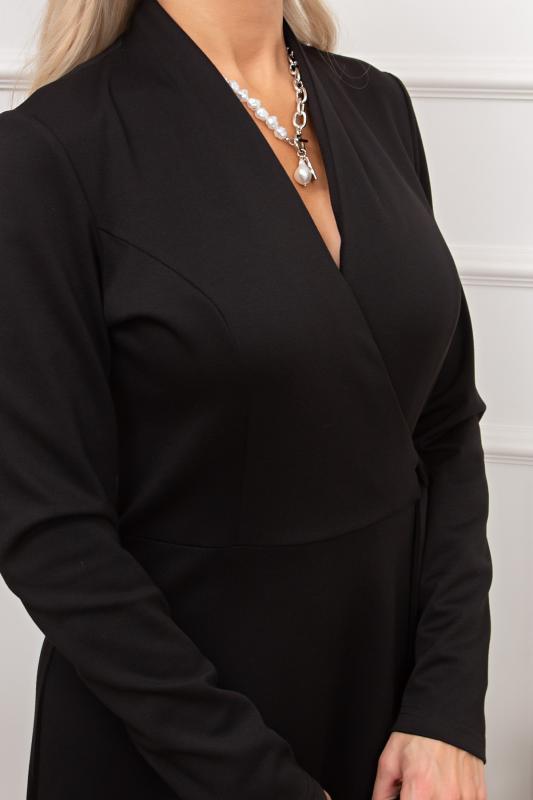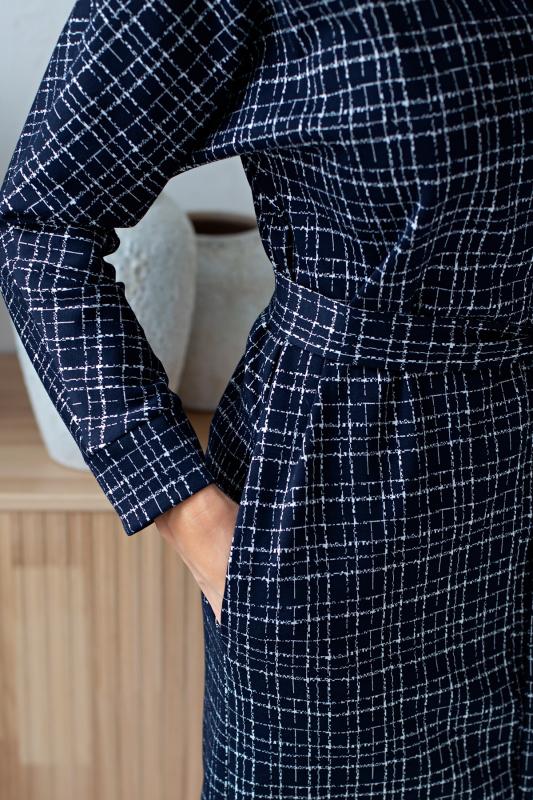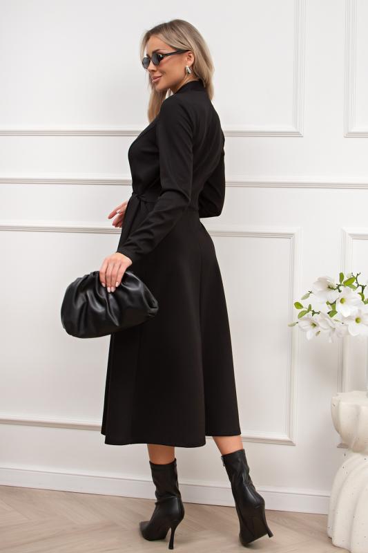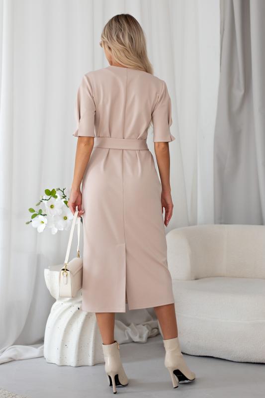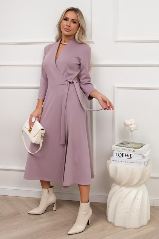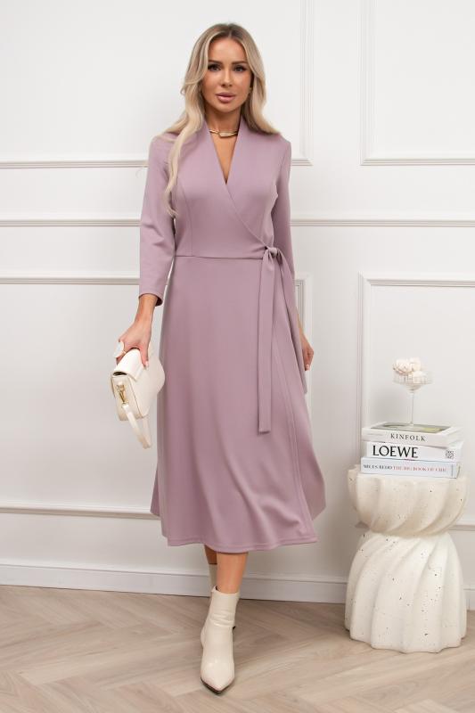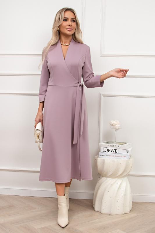 Женственное платье приталенного силуэта изготовлено из трикотажного полотна.V-образная горловина с цельнокроеной стойкой. Длинный втачной рукав. Модель отрезная по линии талии на запахе, сбоку пояс-завязка. Низ ровный, без разрезов.