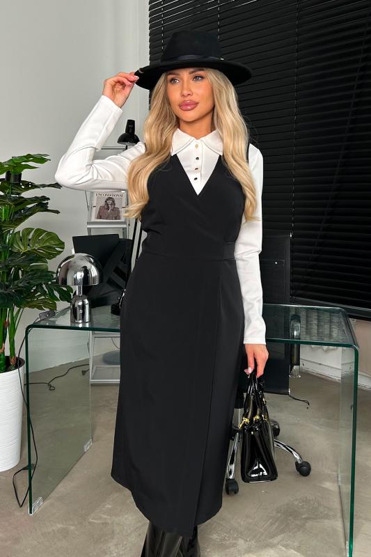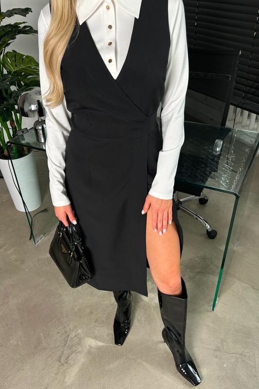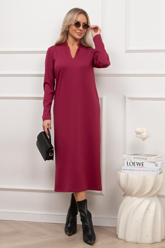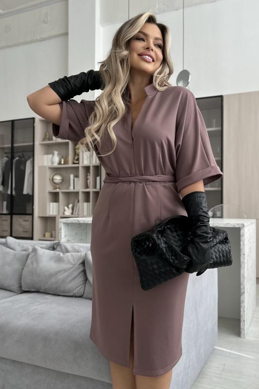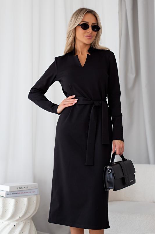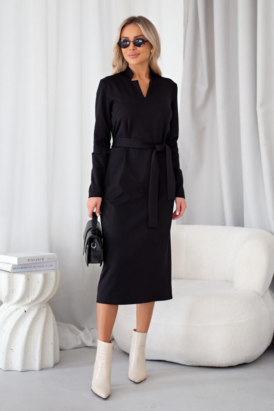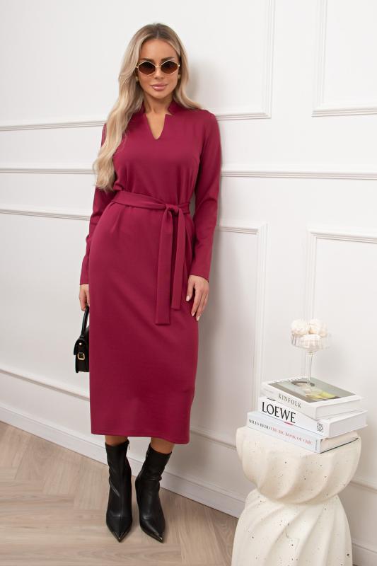 Лаконичное платье прямого силуэта изготовлено из трикотажного полотна. V-образная горловина с цельнокроеной стойкой. Длинный втачной рукав. Низ прямой, сзади шлица. Пояс из основной ткани в комплекте.
