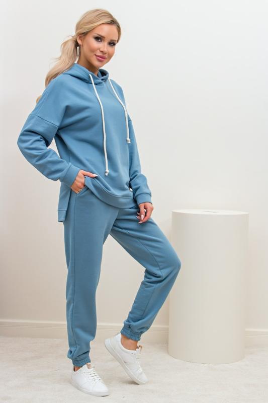 Стильный костюм из трикотажного полотна - футер. Состоит из толстовки и брюк. Толстовка свободного кроя со спущенным плечом. Длинный рукав со спущенным плечом, оканчивается притачной манжетой. Модель с капюшоном. Низ ассиметричный, оформление манжетой, по бокам разрезы. Брюки с комфортной посадкой на талии, которую обеспечивает пояс на резинке. Брючины оканчиваются широкими манжетами на резинке. Модель имеет функциональные карманы в боковых швах. Идеальный вариант для спорта и отдыха.