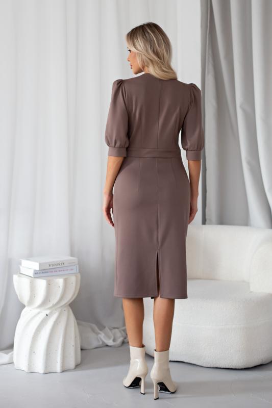 Лаконичное платье прилегающего силуэта изготовлено из трикотажного полотна. Округлая горловина на внутренней обтачке. Короткий втачной рукав. По среднему шву спинки застежка на потайную молнию. Низ ровный, сзади шлица.