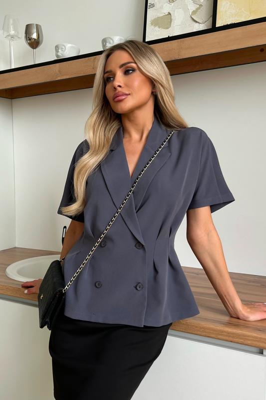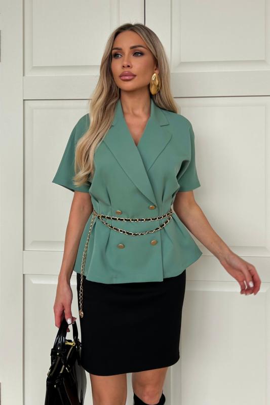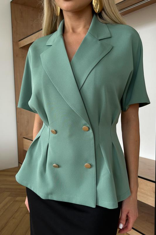 Комфортный летний жакет приталенного силуэта выполнен из легкой костюмной ткани. Цельнокроенный короткий рукав. Английский отложной воротник. Двубортная застежка на петли и пуговицы. По линии талии застрочены складки. Низ ровный без рзрезов.