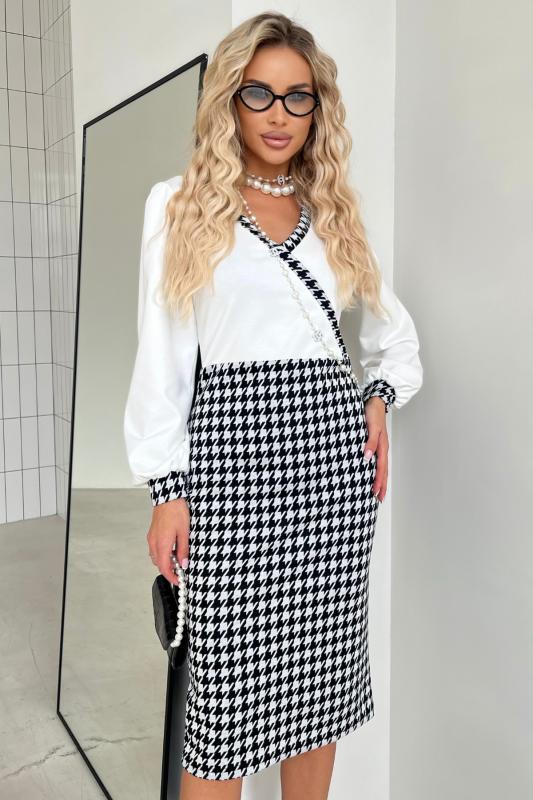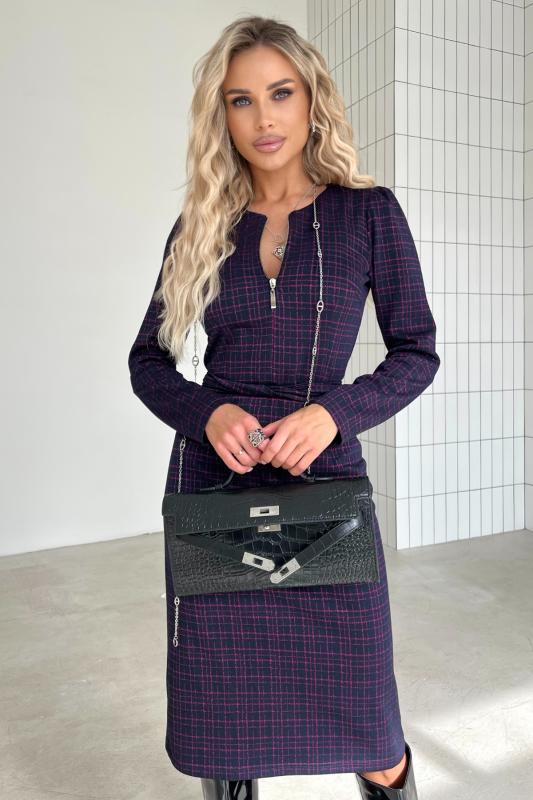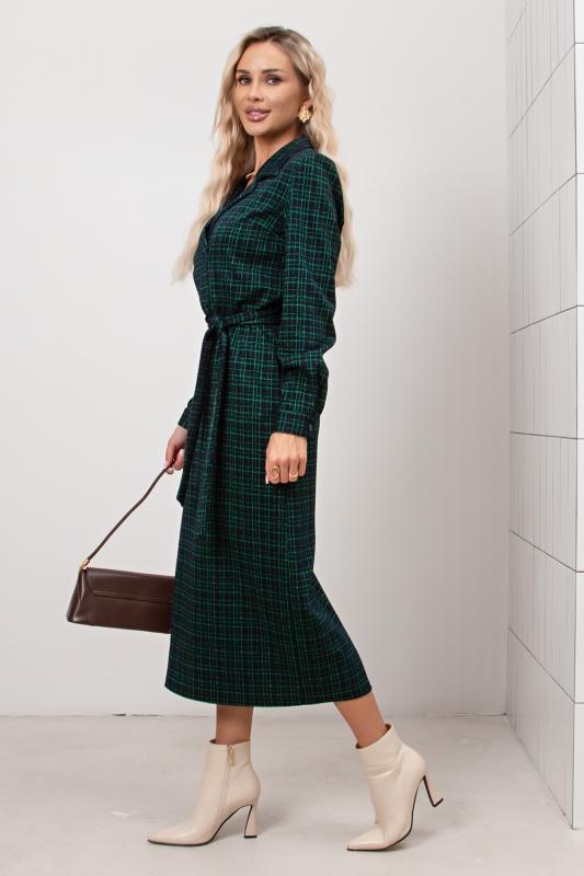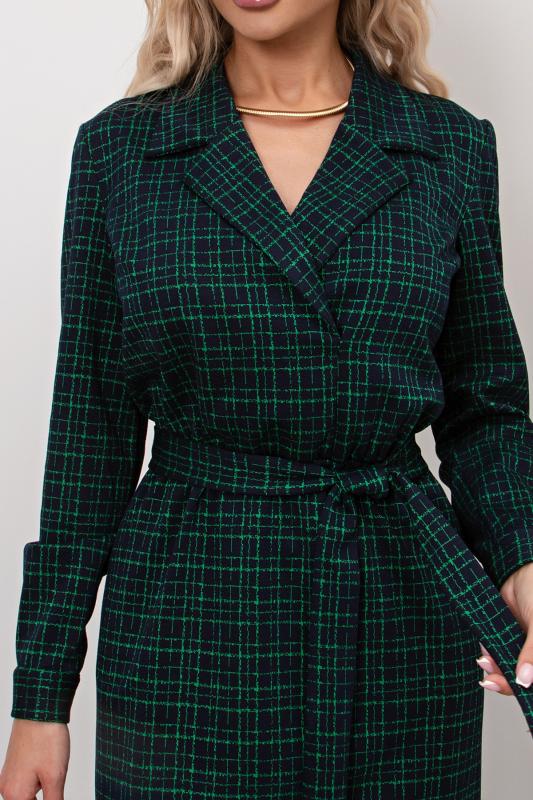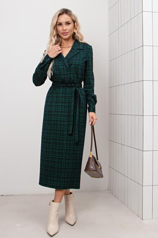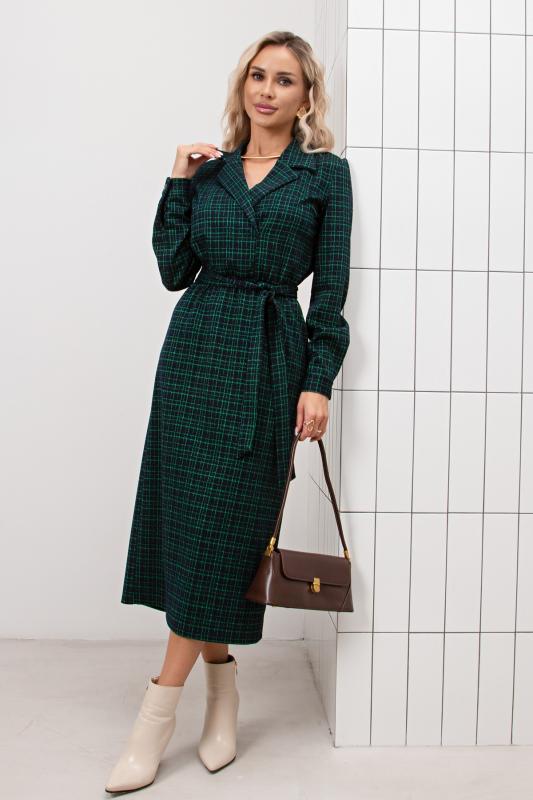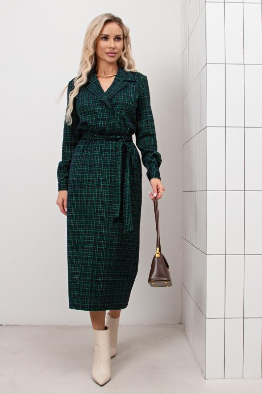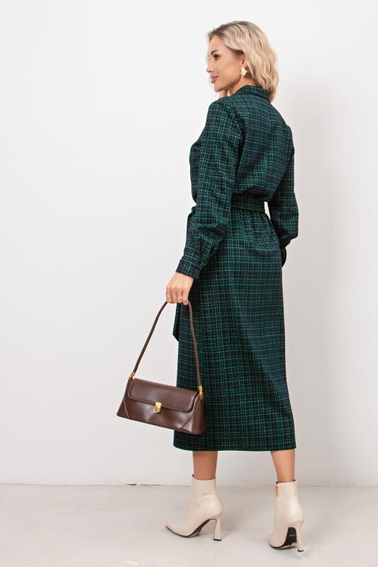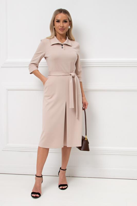 Платье полуприлегающего силуэта из трикотажного полотна. Втачной рукав 3-4 оканчивается притачной манжетой. Горловина оформлена отложным воротником переходящим в планку с застежкой на петли и пуговицы. Модель отрезная по линии талии. По переду юбки заложена встречная складка. По боковым выполнен функциональный карман с отрезным бочком. По спинке застежка на потайную молнию. Тканевый пояс дополнительно подчеркнет линию талии. Модель прекрасно подойдет для создания делового образа.