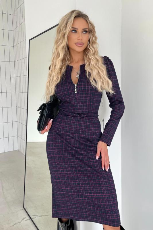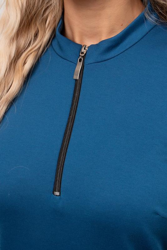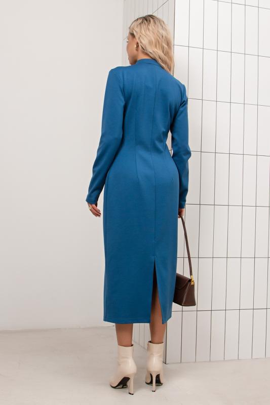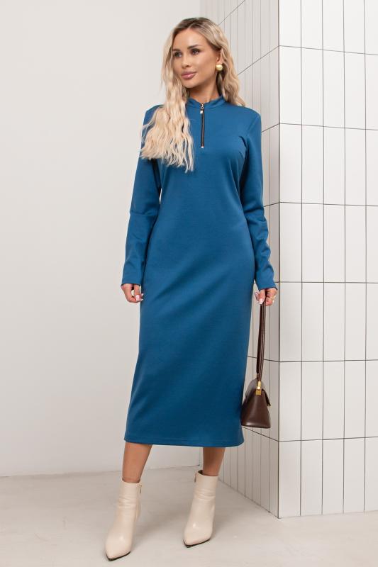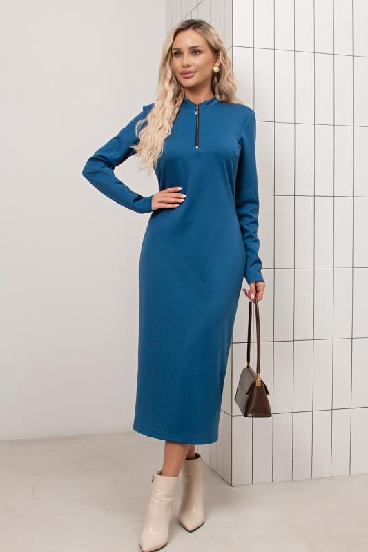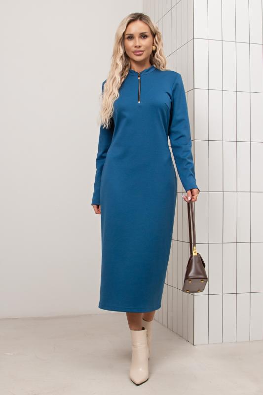 Платье прилегающего силуэта из однотонного трикотажного полотна. Горловина оформлена воротником - стойкой с застежкой на молнию. Длинный втачной рукав. Низ ровный, сзади разрез.