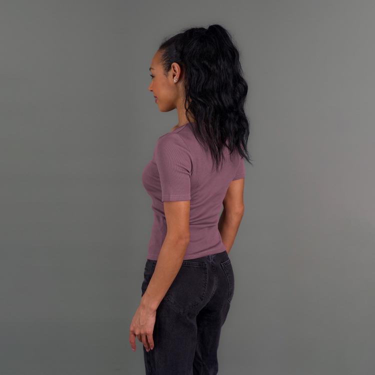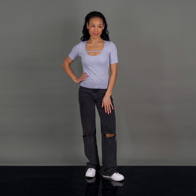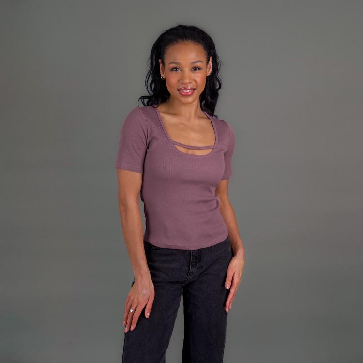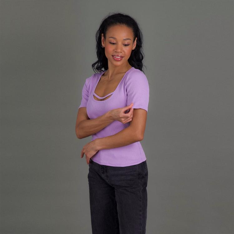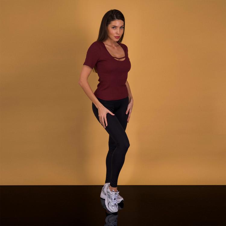 Женская футболка приталенного силуэта с глубоким вырезом и декоративной отделкой.Материал: