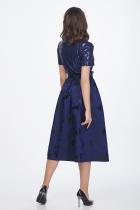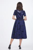 Эффектная юбка из жаккардового полотна с растительным узором. Верх на широком притачном поясе, дополнен встречными мягкими складками. В среднем шве спинки расположена застежка на пуговицу и потайную молнию. Низ ровный, без разрезов. Модель без подклада.