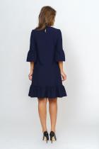 Стильное платье прямого силуэта из однотонного костюмного полотна. Втачные рукава ¾ оканчиваются воланами. Круглая горловина на внутренней обтачке. Застежка на петлю и пуговицу расположена в среднем шве спинки. Низ без разрезов, оформлен воланами. Платье добавит образу женственности и воздушности.