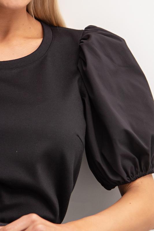 Женственная блуза прилегающего силуэта из трикотажного полотна. Округлая горловина. Втачной рукав - фонарик из поплина присборен на эластичную резинку. Низ ровный, без разрезов.