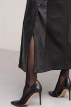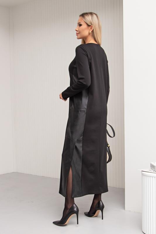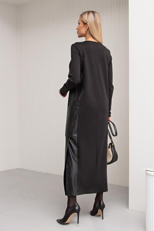 Элегантное платье прямого кроя из трикотажного полотна. По бокам вставка из эко - кожи, дополнена функциональными карманами. Округлая горловина на внутренней обтачке. Длинные втачные рукава. По спинке застёжка на потайную молнию. Низ ровный, по бокам разрезы.