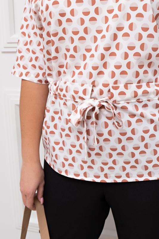 Блузка выполнена из легкой ткани Ниагара. Короткий рукав со спущенным плечом. Округлая горловина на внутренней обтачке. Модель дополняет кулиска, что позволяет подчеркнуть линию талии. Низ ровный, без разрезов.