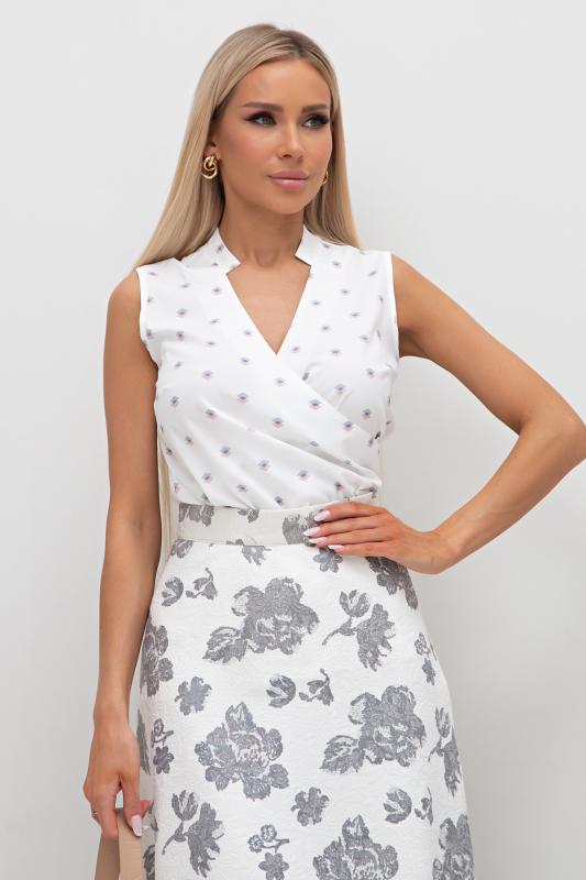 Стильная блузка прямого кроя из легкой ткани Ниагара с оригинальным принтом. Модель без рукавов. Фигурная горловина с воротником - стойка, переходящая в запах. Низ ровный, без разрезов.