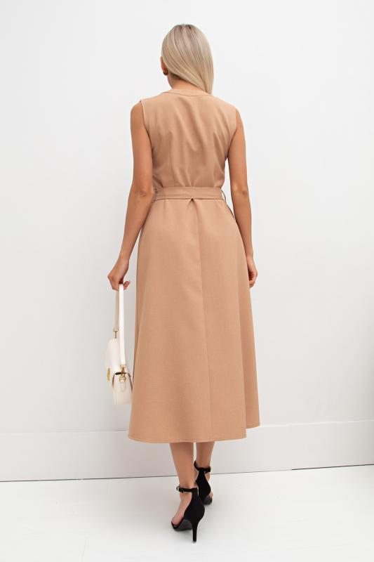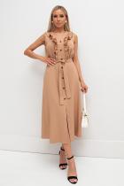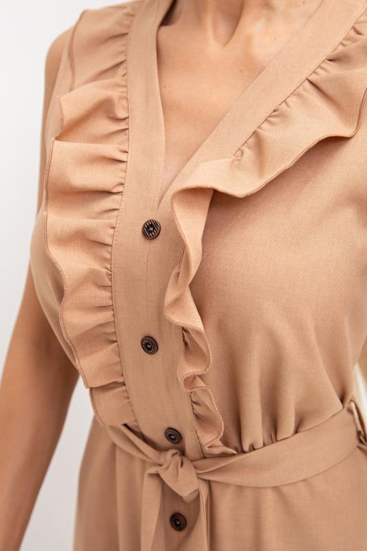 Женственное платье приталенного силуэта. V-образная горловина на внутренней обтачке. Платье отрезное по линии талии. Перед оформлен рюшей вдоль планки, декорированной пуговицами. Низ ровный, по переду разрез. Пояс из основного материала в комплекте.