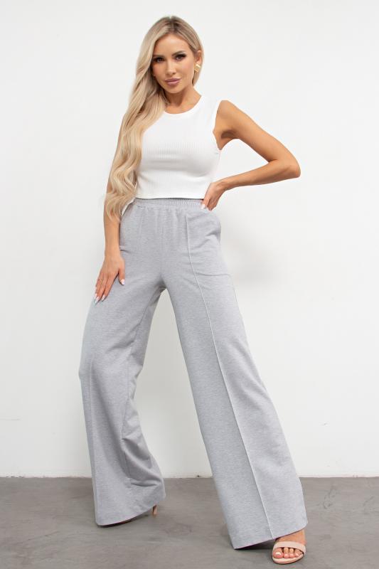 Прямые брюки из трикотажного полотна. Отрезной пояс по линии талии на широкой резинке. Спереди стрелка закреплена строчкой, что зрительно удлиняет ноги. Боковые карманы с отрезным бочком. Модель выполнена из качественного трикотажа, который хорошо держит форму. Прекрасная модель для активных будней и отдыха.