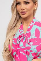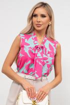 Элегантная блузка из легкой ткани с оригинальным принтом. Горловина оформлена стойкой переходящей в завязку - бант. Модель без рукавов. Низ ровный, без разрезов.