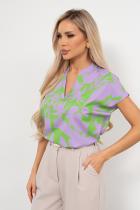 Блузка с оригинальным принтом из легкой ткани Ниагара. V - образная горловина оформлена воротником - стойка. Короткий цельнокроеный рукав. Низ ровный, без разрезов.