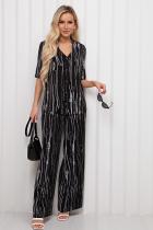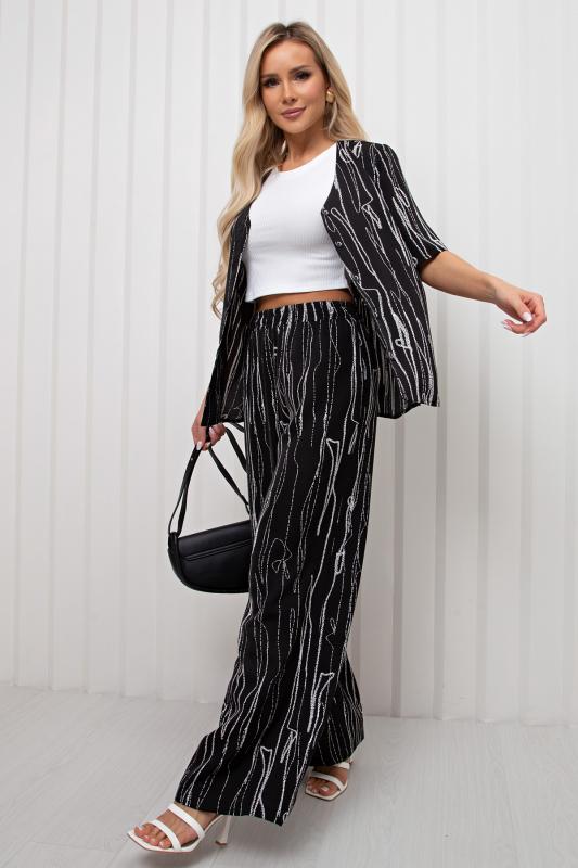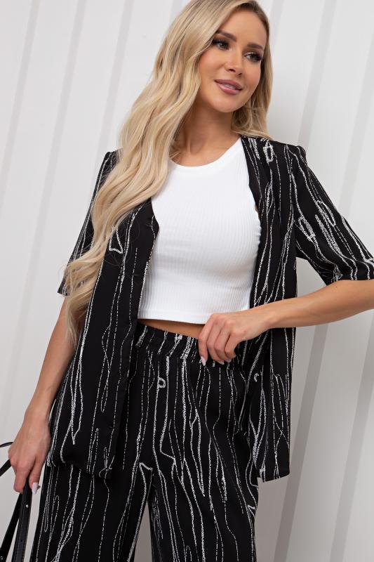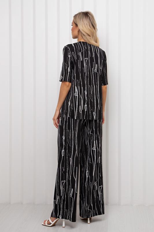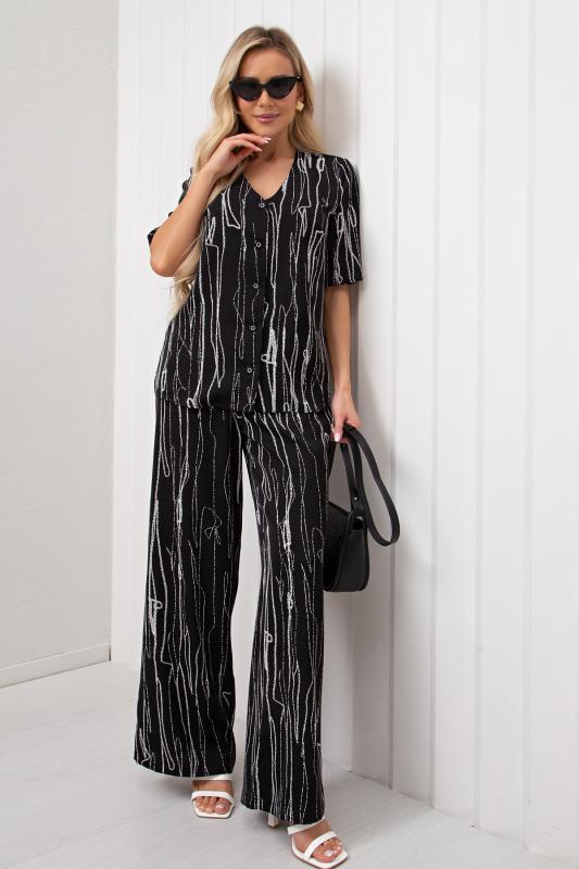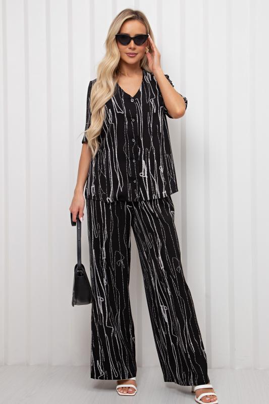 Легкий костюм свободного кроя. Рубашка прямого кроя с коротким втачным рукавом. V - образная горловина, переходящая в планку с застежкой на петли и пуговицы. Низ прямой, по бокам разрезы. Брюки с комфортной посадкой на талии, которую обеспечивает притачной пояс на резинке.