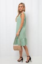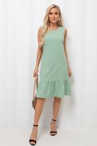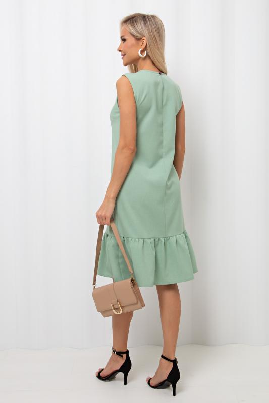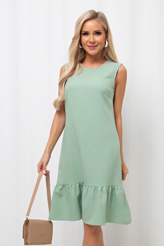 Нежное платье прямого силуэта из однотонного натурального полотна. Круглая горловина и пройма на обтачке. В среднем шве спинки расположен разрез с застежкой на пуговицу. Низ ровный, дополнен широким воланом.