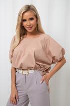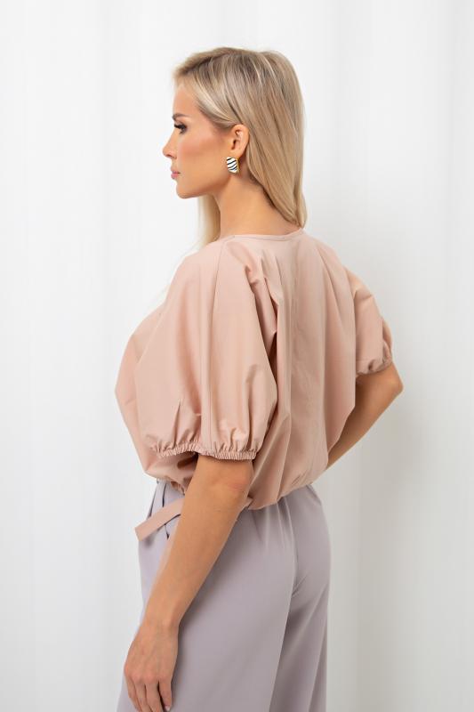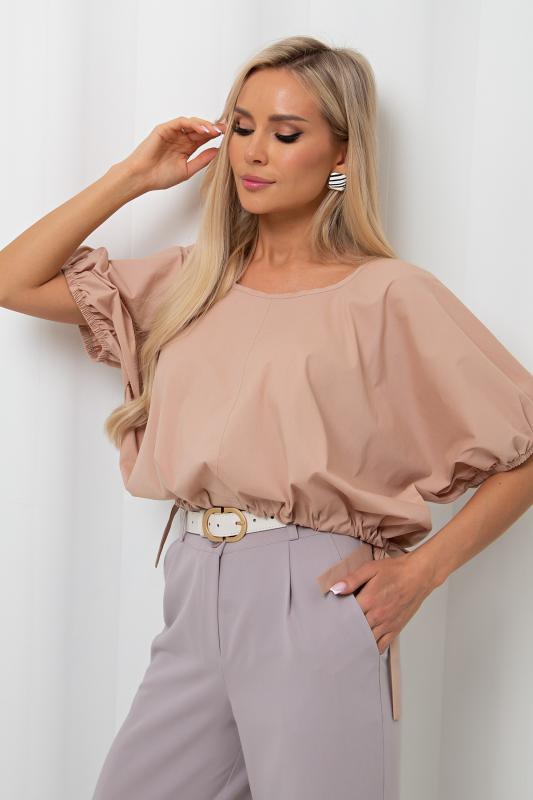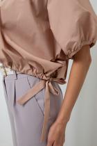 Стильная укороченная блуза свободного кроя. Округлая горловина. Короткий цельнокроеный рукав присобран на резинку. Низ изделия дополнен кулиской.