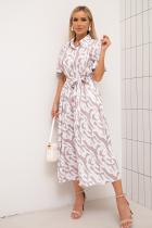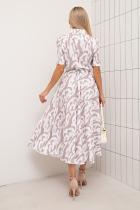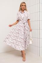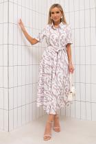Женственное платье приталенного силуэта из легкой ткани с оригинальным принтом. Втачной короткий рукав оканчивается притачной манжетой с отворотом. Горловина оформлена классическим воротником на стойке. По переду выполнена планка с застежкой на петли и пуговицы. Модель отрезная по линии талии, присборена на эластичную резинку и дополнена шлевками под пояс. По бокам функциональные карманы. Низ ровный, без разрезов. Пояс из основного материала в комплекте.