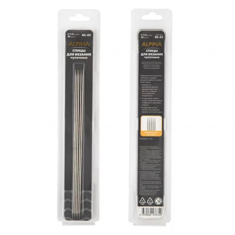 Спицы для вязания чулочные Alpina SIL-05 предназначены для вязания небольших и средних размеров изделий из пряжи любых видов. Сделаны из высококачественной нержавеющей стали AISI 304 с гладкой отполированной поверхностью. Спицы внутри полые и легкие, что делает вязание комфортным, увеличивая скорость. Острые удлиненные кончики спиц идеально подходят для тонкой пряжи.Длина спиц 20 см.