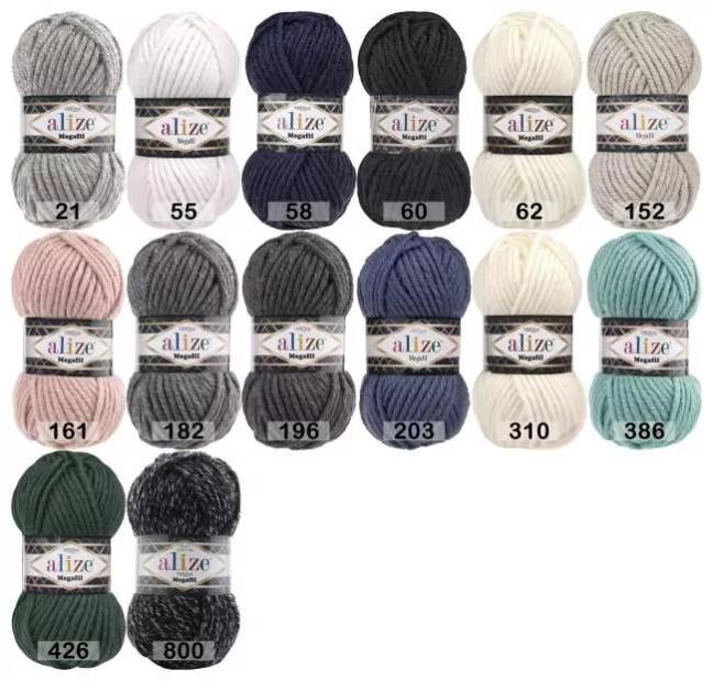 Ализе мегафил. Очень толстая однотонная пряжа средней толщины с 25% шерсти. Подходит для создания снудов, кардиганы, шапок и шарфов из этой пряжи отлично держат форму и прекрасно согреют Вас в холодную погоду. Инструменты: спицы 12-15, крючок 10 - 12. Рекомендации по уходу за изделием: Деликатная стирка при температуре 30 градусов. Не отбеливать. Гладить при температуре не выше 120 градусов. Сушить на горизонтальной поверхности, нельзя отбеливать.