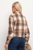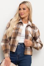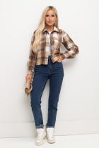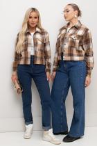 Кроп - жакет прямого кроя. Английский отложной воротник. Перед оформлен накладными карманами с клапанами. Длинный втачной рукав оканчивается притачной манжетой. Застежка на петли и пуговицы. Модель без подкладки. Низ ровный, оформлен манжетой.