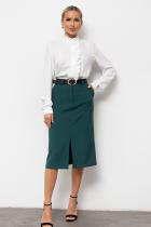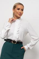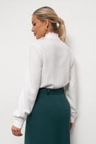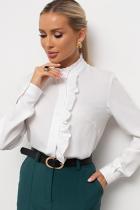 Женственная блузка прямого силуэта. Горловина оформлена воротником - стойка с рюшей. По переду планка с застежкой на петли и пуговицы, декорирована рюшей. Длинный втачной рукав оканчивается притачной манжетой. Низ ровный, без разрезов.