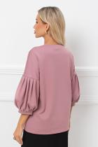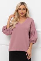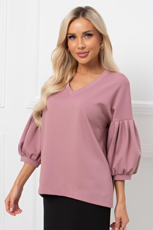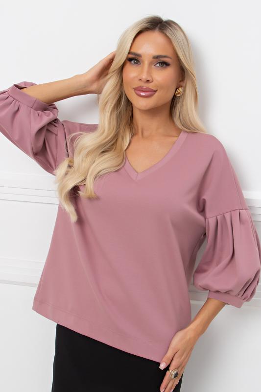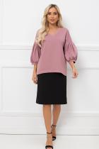 Женственный джемпер свободного кроя из трикотажного полотна. V - образная горловина оформлена внешней обтачкой. Втачной рукав длинной 3-4 со спущенным плечом, оканчивается притачной манжетой. Объем рукаву придают заложенные защипы. Низ ровный, без разрезов.